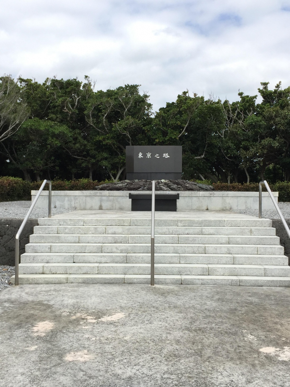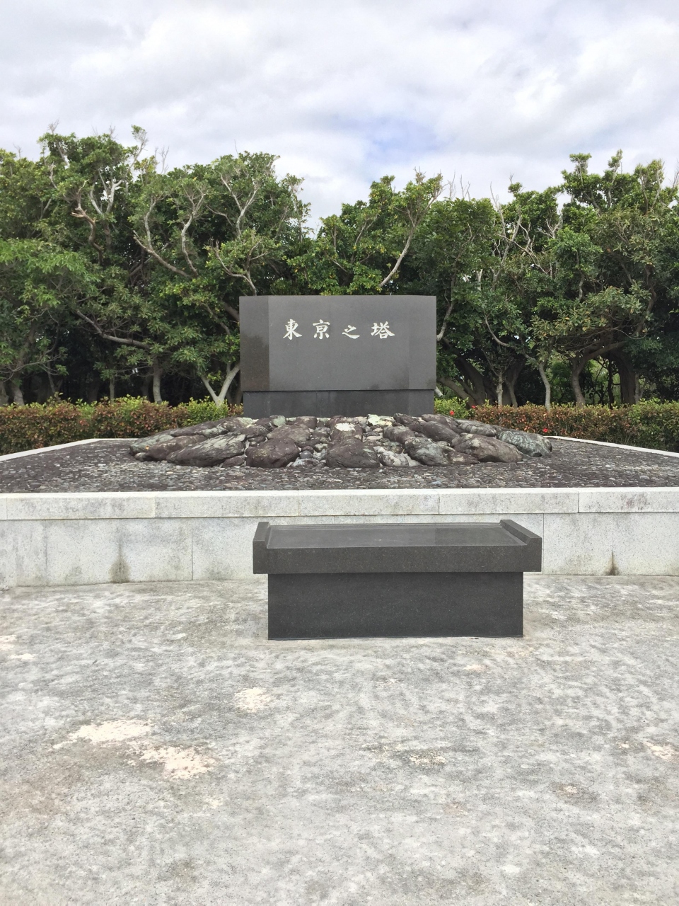 塔正面には階段が繋がり、喫煙コーナーもある休憩施設東屋やトイレまで完備している充実したものになっています。米須霊域に位置する慰霊塔群の最後に目にする東京之塔ゆえ、その格段に広い敷地の様子には違和感すら覚えました。これは先の大戦中に亡くなられた関係者が沖縄県に次いで多いことにも起因するようですが、なんとなく立派過ぎるゆえに思うところもあるように思いました。塔は船型式の黒御影石でできており、その前には遺族の代表者によって多摩川にて集められた小石を敷き詰めた64平方メートルの基壇が置かれており、その中央に設けてある半径5mの塚には当時の区市町村数64個のそれぞれの街を象徴する石によって構成されています。