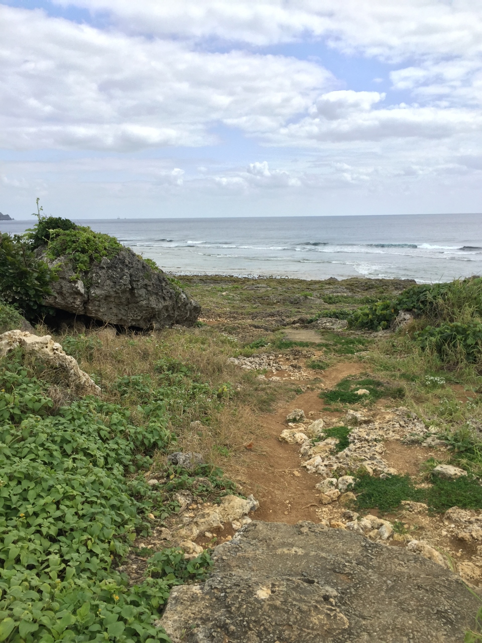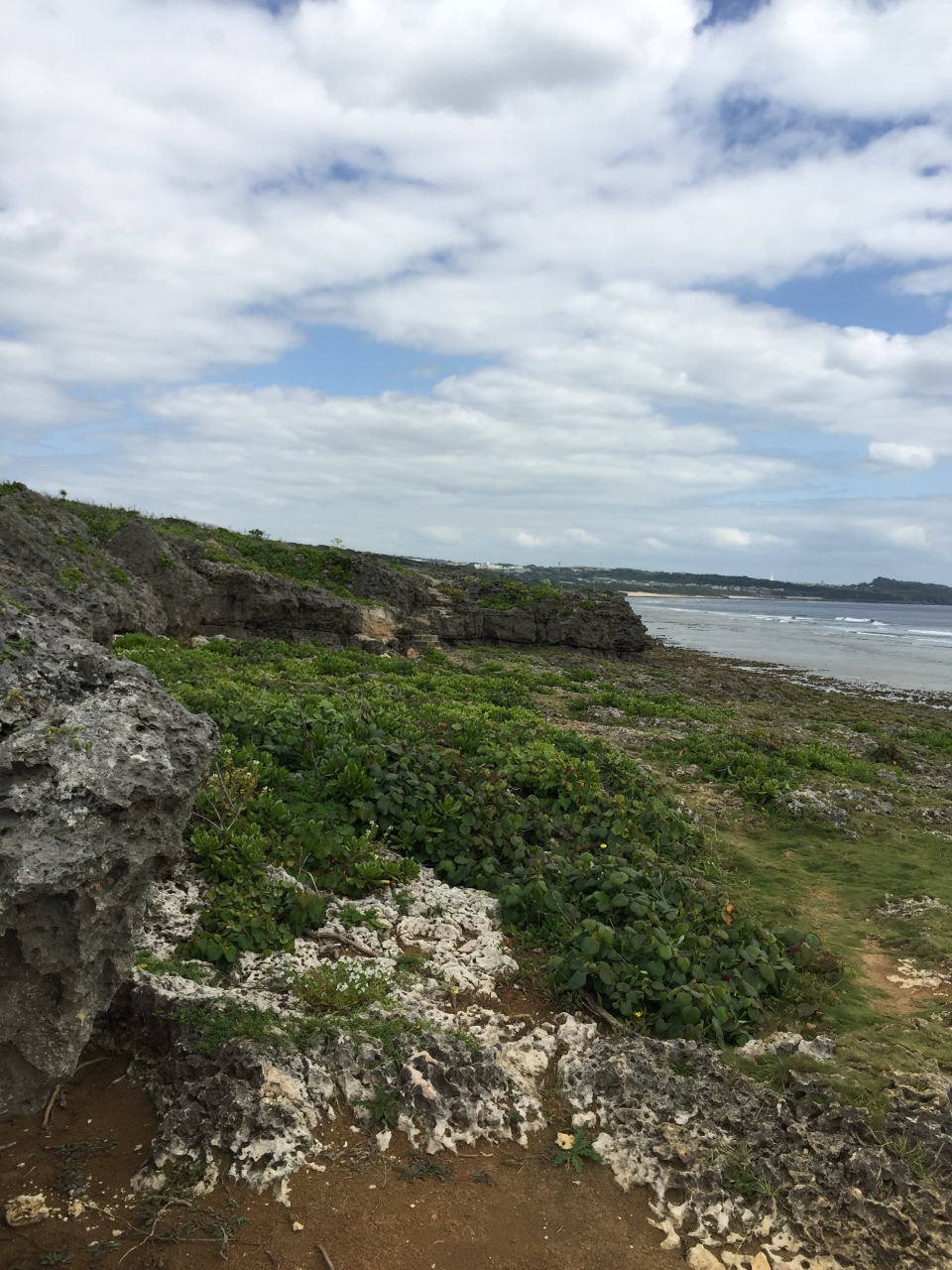 数年前の遺骨収集の際に、付近から20余名の遺骨と第一高等女学校の校章が発見されています。山城の壕を出る時に制服を着て出発された乙女たちが、どのような気持ちでこの荒崎の地で亡くなったのかは今となっては知る由もありません。波風はそのときと変わらず激しいものだとは思うものの、遠景に平和祈念堂が見えている今の景色にふと平和だなと呟いてしまいました。