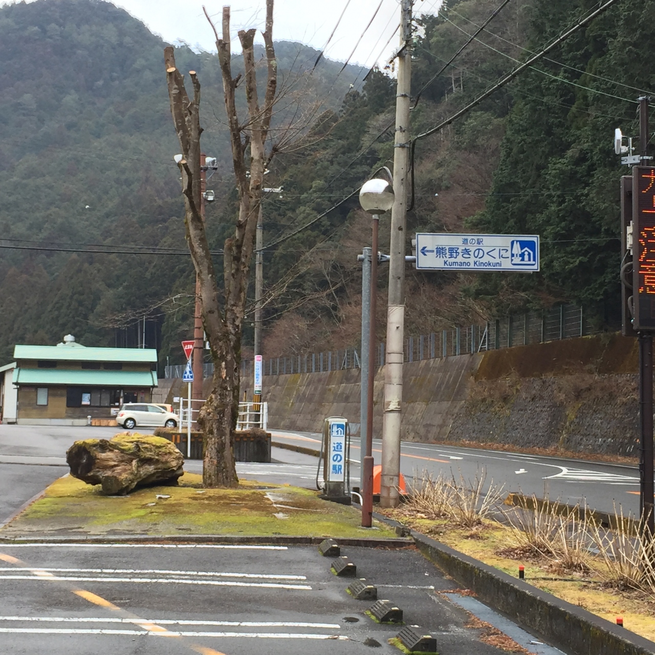 しかし平成25(2013)年9月29日、国道42号線の高規格自動車専用道路として熊野尾鷲道路が開通し、旧道となった国道42号線を利用する車は激減しました。それにより道の駅熊野きのくにの利用客も激減し、平成27(2015)年10月23日を以って閉鎖となりました。熊野尾鷲道路にはサービスエリアやパーキングエリア等の休憩施設がなく、この道の駅熊野きのくにが熊野新鹿(くまのあたしか)インター付近に移設されることも検討されたようですが、施設閉鎖により計画は頓挫したようです。