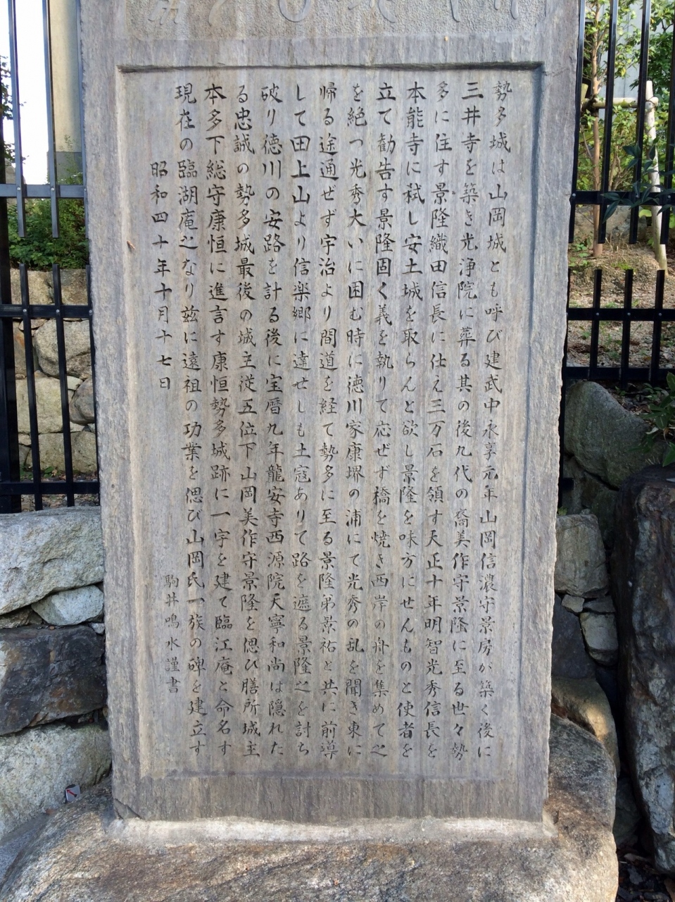 建武元年(西暦1334)に山岡信濃守景房によって建てられました。瀬田の唐橋という交通の要所にあり、幾度と争いの渦中に置かれました。天正十年(西暦1582)明智光秀が本能寺の変にて織田信長を自害に追い込んだ後、安土城に攻め入る際に、瀬田城主山岡景隆に協力を求めたが、信長に恩義を持つ景隆は逆に瀬田の唐橋共々瀬田城を焼き払い、明智の安土攻めに抵抗しました。戦国の世にわずか250年の間あった城ですが、本能寺の変により駿府へ逃げ帰る徳川家康の道案内をしたことから、江戸時代膳所藩主本多氏より藩別邸として臨湖庵が当地に造られ、景隆の功績を後世に残すとされました。