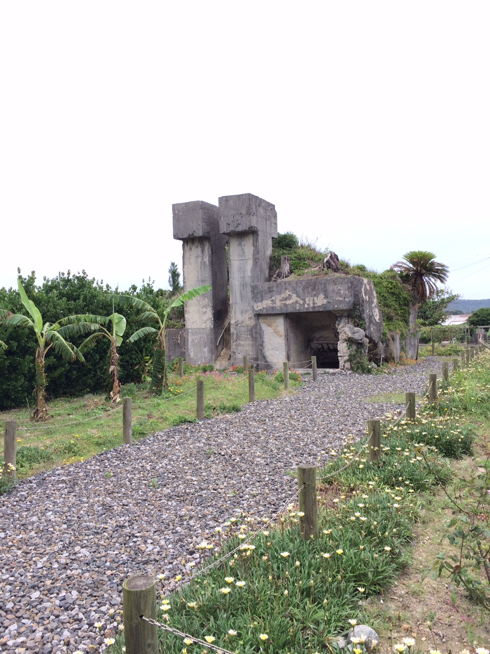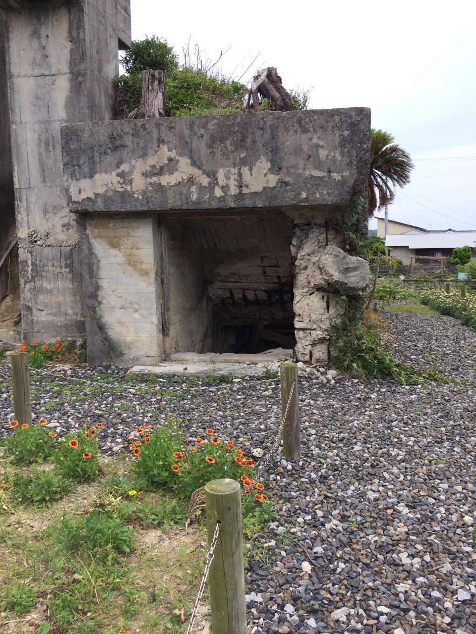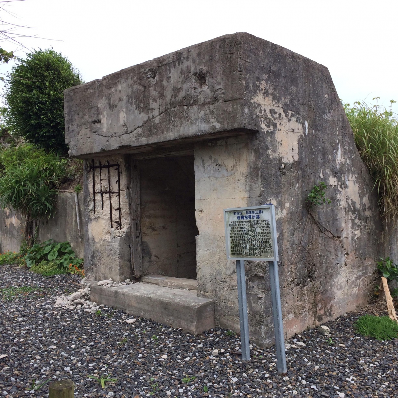 レンタカーを借りる際に、場所をお聞きして行きました。爆撃などによる破壊によって機能が麻痺しないようにH字の形に作られ、4つの出入口が現存します。いつ作られたかは軍の機密事項ということで不明ですが、70年以上の月日が経っているにもかかわらず保存状態は非常に良いもので、鉄筋が入っていることからも?にわか作り?ではないことがわかります。現喜界空港が海軍飛行場であったことから、喜界島は爆撃による被害が大きく、この?戦闘指揮所跡?も例外には漏れず、入口の一箇所ではその爆撃による破損を見ることができます。