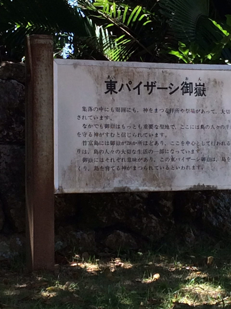 竹富島には集落の内外に28ヶ所ほどの御嶽があります。御嶽とは古来より島々の人々の生活を守る神が宿ると信じられており、ここを中心として行われる祭りは、島の人々の大切な生活の一部となっています。御嶽にはそれぞれ意味があり、この東パイサージ御嶽(あいぱいさーじおん)は、島をつくり島を育てる神が祀られているといわれます。