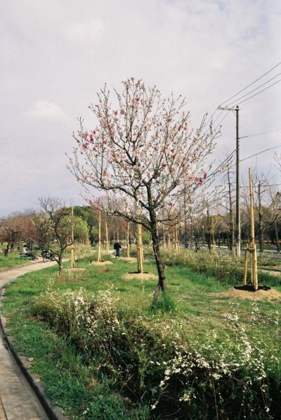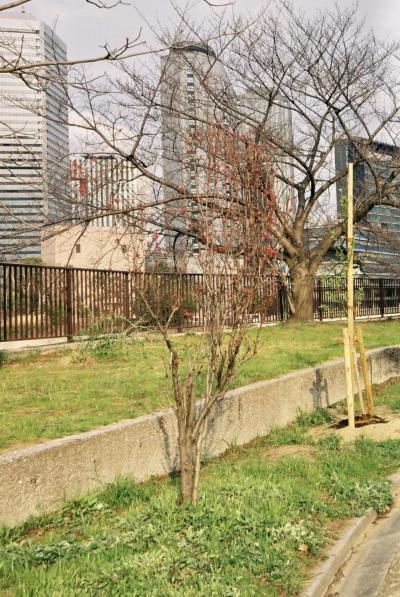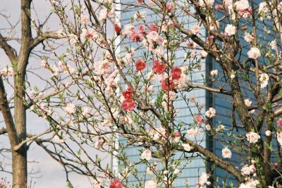 もう少し花が咲けば、背景のビルに負けないものになるのでしょうが、訪れた日では背景が目立ち過ぎて桃の花がわからない残念なものになってしまいました。