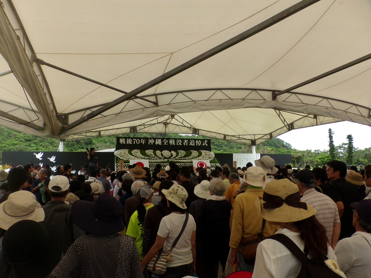 今年は戦後70年の節目を迎えるにあたり報道発表では5,400人とは言われていますが、いつもよりはるか多くの人々の来訪があったようです。11:50から式典が始まり12:00から1分間の黙とうを捧げた後式典が進みます。翁長知事の平和宣言には?なぜこの場で??と思える拍手があったと思えば、その後の安倍総理の時には心ないヤジがぽつりぽつり…。誰が言ったかという問題ではなく、追悼式典という一年に一回のことを台無しにする?行為そのもの?に対して怒りを感じました。特に今年は戦後70年という節目の年だったこともあり、沖縄戦に徴兵された兵士のご家族の方々が、今回の慰霊の日の訪沖を最後にしようと考えておられたことも多いと聞いていました。その最後の式典を台無しにする行為…、これを支持する考えが理解できません。