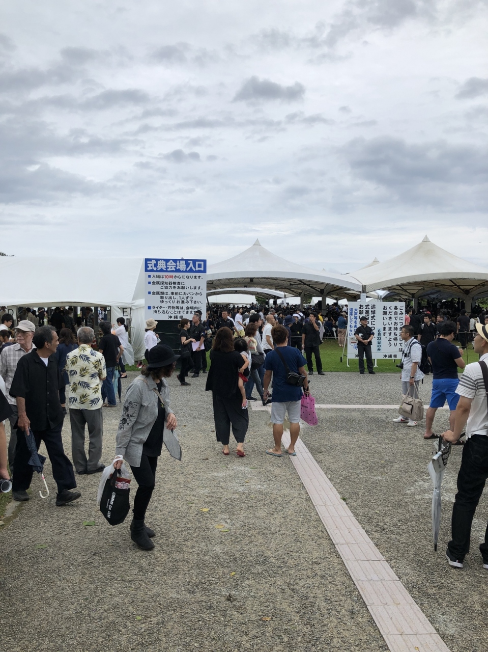 当日の混雑は想像を絶するものがありました。許可車両以外は会場となる平和祈念公園駐車場に原則入ることができずに付近の特設駐車場に車を停めて、シャトルバスで向かうことになります。また?式典参加者?とカウントされる数には、実際に現地で見た人の数と大きな開きを感じますが、この式典参加者とは?手続きを取って追悼式典会場に入った方?の数の総数であり、私も含めた?外野参加?は人数に入っていません。マスコミの発表では一日で30,000人位は来場者がいたとも言われていました。