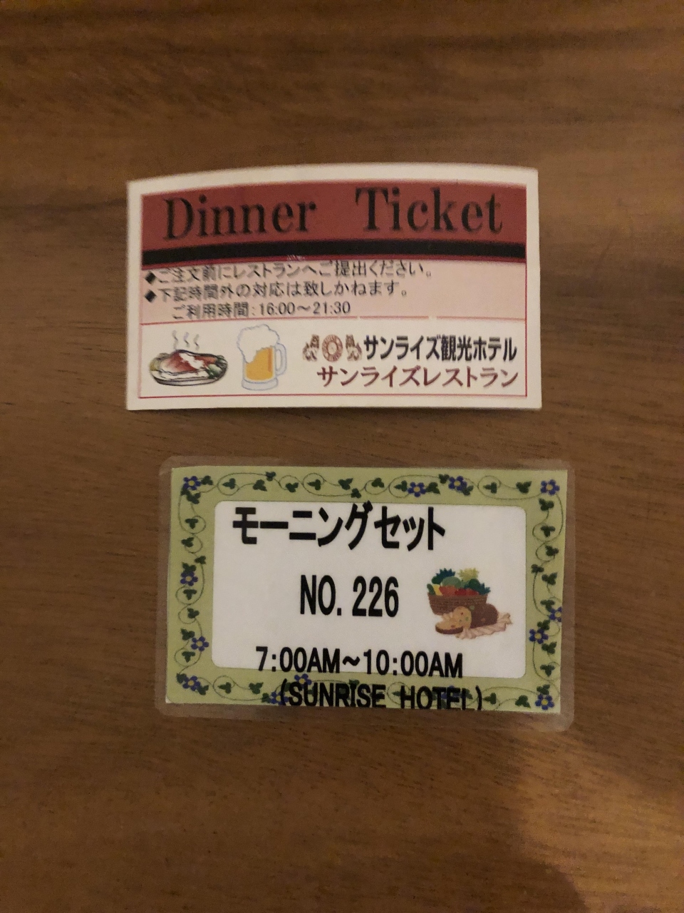 今回は宿泊時の朝・夕食をこちらで頂きました。夕食は書かれている通りの『ステーキ』で、サラダ・スープ・ライスはセルフサービスのお代わり自由。ショボいのが来るのか…思っていたら本格的過ぎるものが出てきてびっくりしました。元々草食系のためサラダ主体に考えていたらのボリュームだったので慌てて配分を変更し、写真のように落ちつけました。ひとつだけ残念だったのがサービスのソフトドリンク。ダイエットコークを頼んだところ味がしない代物でした…。