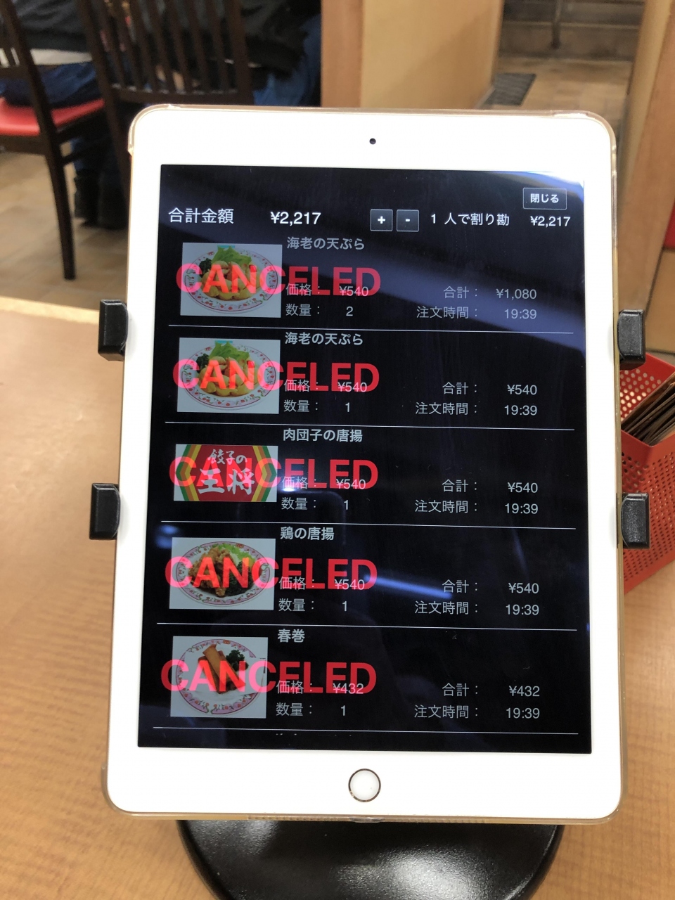 しかし食べ終わった頃にひとつ問題が発覚しました。うちのテーブルからの追加オーダーがたくさん入っており、その確認をされてしまいました。勿論最初にオーダーしたもので十分なのでそれ以上オーダーすることもないし、まして2人で食べられる量でもない…。ひとつ記憶にあることは、料理を持って来てもらった時にタブレットを邪魔にならない場所に動かしたこと。誤作動の理由がわからないと言われるときに何気にやっていることをへ~っと実感した瞬間です。