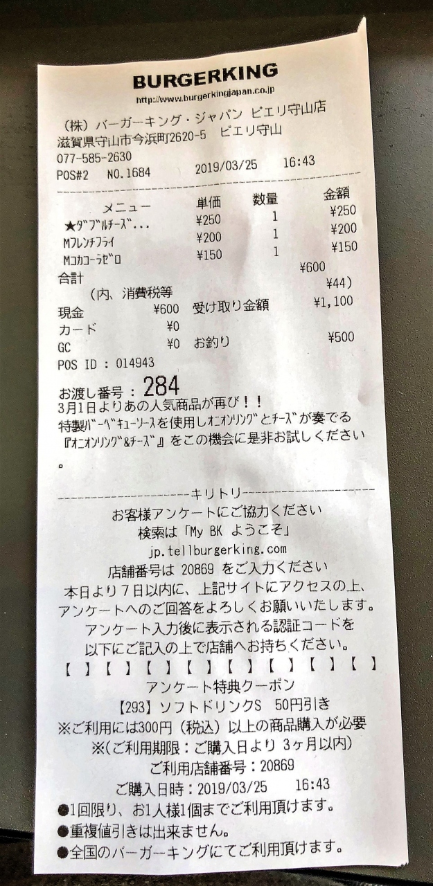 免許の更新後にピエリ守山へと立ち寄りました。小腹が空いたので軽くなにかを・・・と考えている時に、滋賀県では見慣れないバーガーキングを発見し、立ち寄りました。