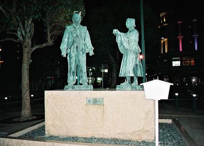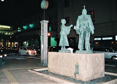 長浜駅前に建立されている立った武将に茶を差し出す小姓。喉が渇いて茶を欲した秀吉に、観音寺の小姓であった三成がぬるいお茶をなみなみと出した後、もう一杯を所望すると少し熱めの茶を少し小ぶりの器で出した。次が気になった秀吉がもう一杯茶を所望すると熱い茶を小ぶりの器で出したことに対し、小姓の心配りを褒め称え、後に五奉行の一人となるまでに取り立てた石田三成との出会いとされる〝三献の茶〟の逸話を偶像化したものになります。