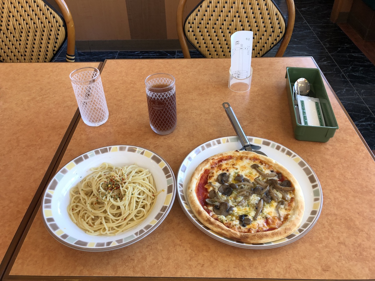 そんなこともあるのかついオーダーを二品頼み、がっつり食べることにします。ペペロンチーノと野菜とキノコのピザ、そしてドリンクバー。あまりサイゼリアには立ち寄らないため、そんなオーダーもありかな?と思いました。程良い量のお料理は、ピザとパスタを手軽に味わえるものだと思います。