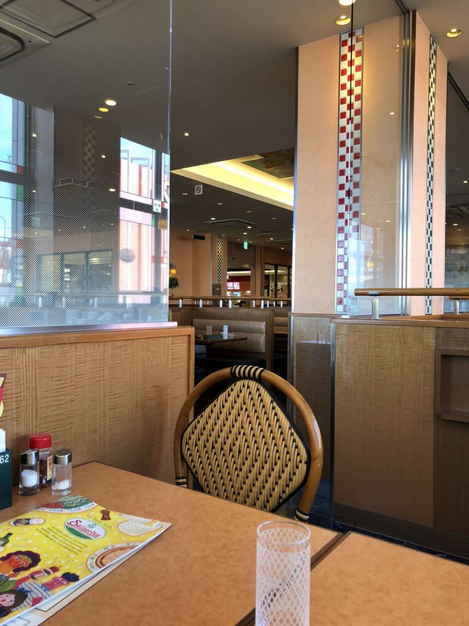 モリーブに行った際に遅めの昼食を摂るために入りました。以前はタバコの吸えるファミレスとして、お茶しがてら長居するお客も多かったのですが、ついにこちらも7月21日から全席禁煙となりました。