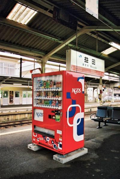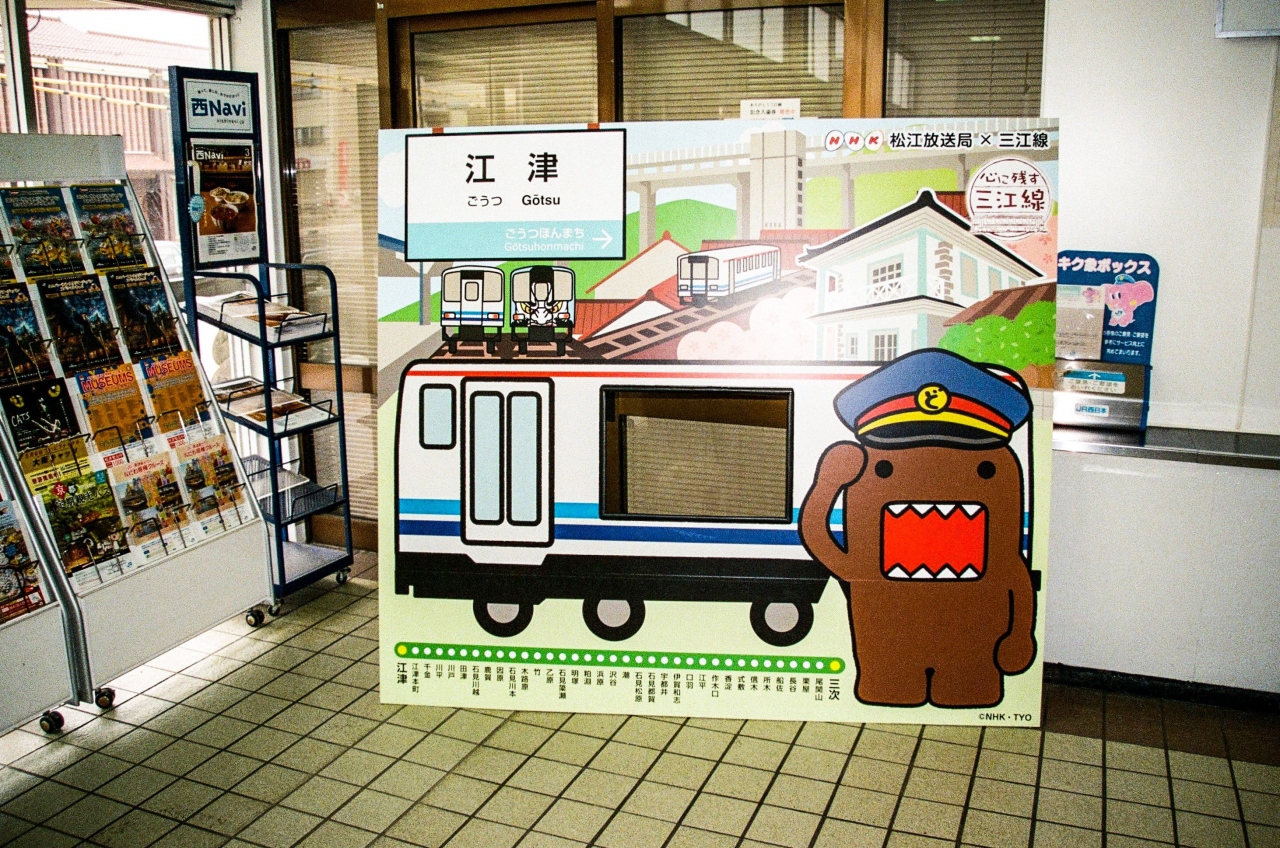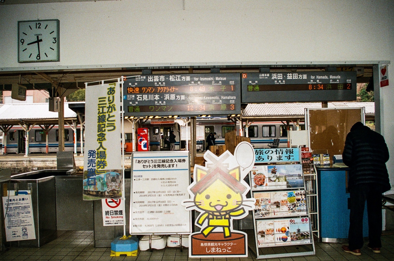 意外にも駅付近に大型のお店や金融機関の江津支店があったりと、ただの田舎のローカル線の駅とは異なります。利用客数も500人近かったこともあったようで、現在でも三桁の乗降客がある駅として無人化されたのは平成17(2005)年と遅い方でした。駅舎内にキオスクがあったこともある駅として、その名残からか自動券売機が備え付けられていることは、少しびっくりしました。