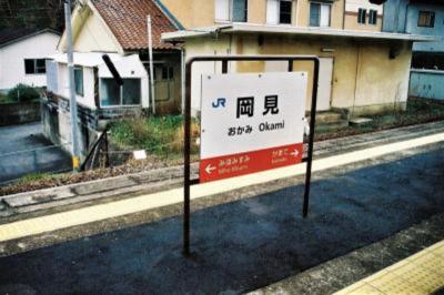 大正15(1926)年に既に開通していた三保三隅駅と鎌手駅の間に開業した岡見駅は、築堤上に設けられた高架駅となっています。1面2線の島式ホームは端から見ても弧を描いているのがわかります。