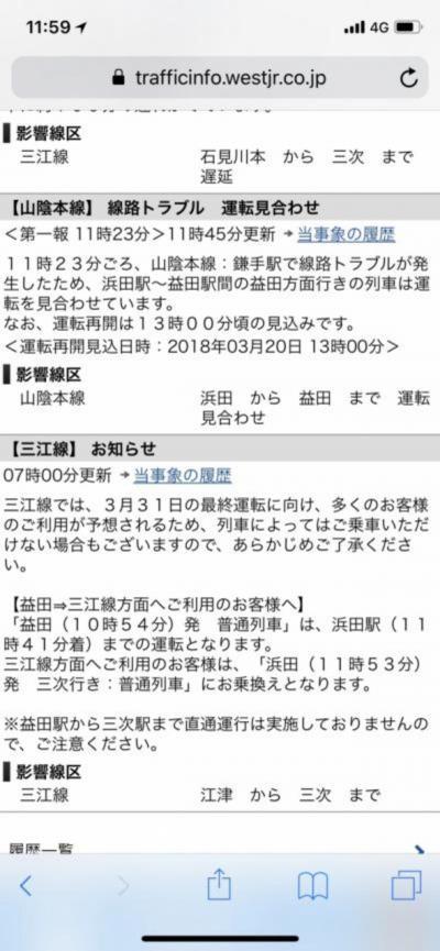 幸いなことに西浜田での停車は20分程だったことに加えて、浜田駅での三江線列車への乗り継ぎも確保されことなきことを得ましたが、やはり山陰本線上でのトラブルには少し閉口してしまいました。ローカル線故に道路が優先されるのかも知れませんが、できればこのようなことは起こらないようにして欲しいように思います。- 旅行時期