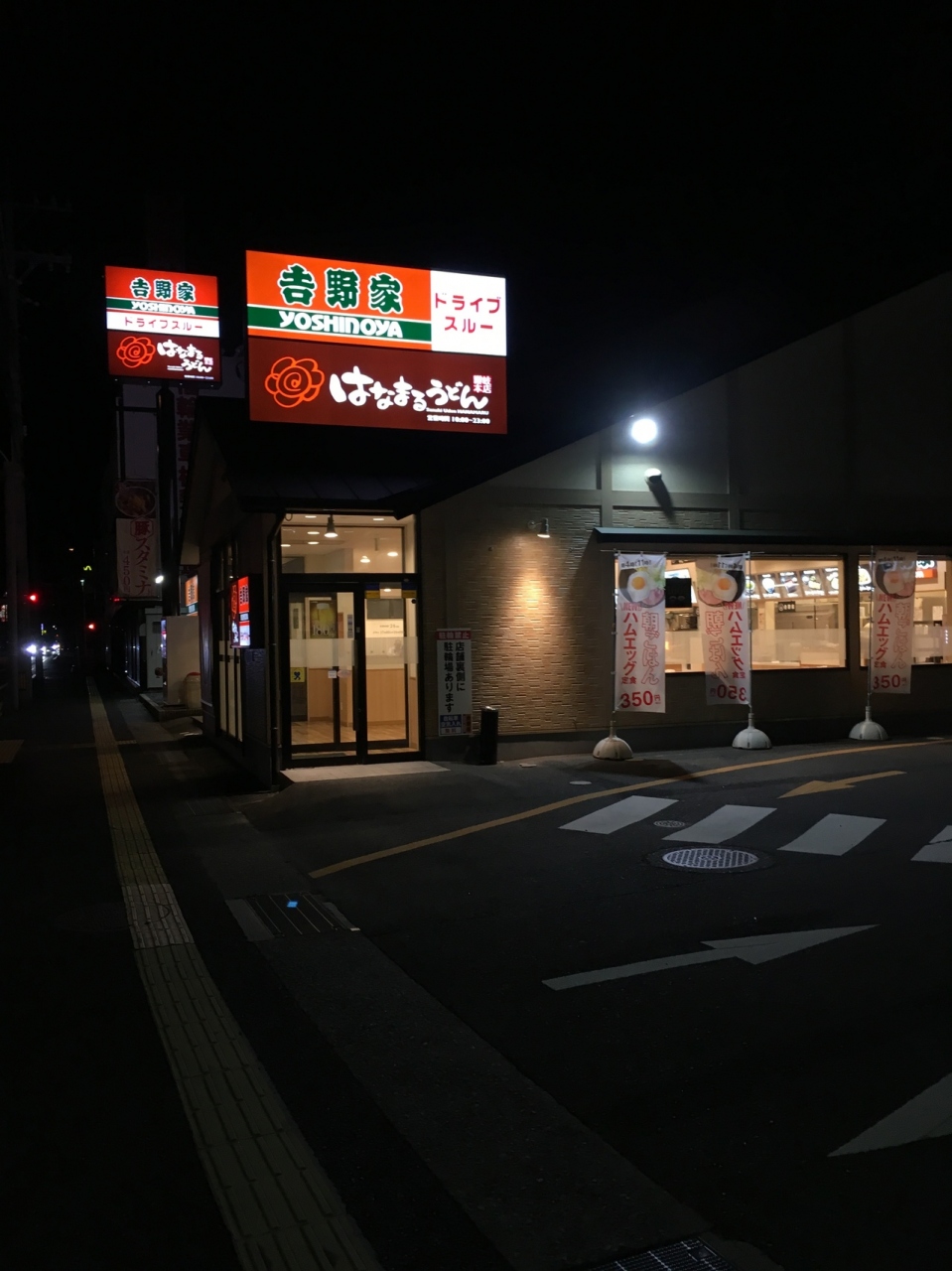 吉野家2号線岩国店は、はなまるうどんと吉野家が一緒になっている珍しいお店です。呉から徳山に移動する途中にその変わったお店の看板を見つけて立ち寄りました。