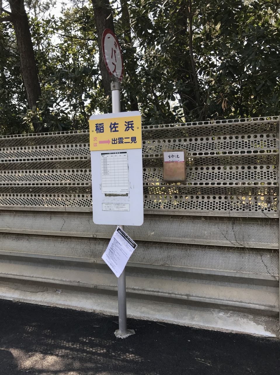 最寄バス停の名称が4月1日から〝稲佐浜〟から〝稲佐の浜〟へと変わりました。駐車場もあり交通手段問わず訪れることができる場所ではあるものの、オススメはやはり出雲大社から〝歩き〟かと思います。バスに乗ってしまうと5分ほどですが、歩いても20~30分位です。私はバスの待ち時間を利用したので、阿国の道を歩くことができました。