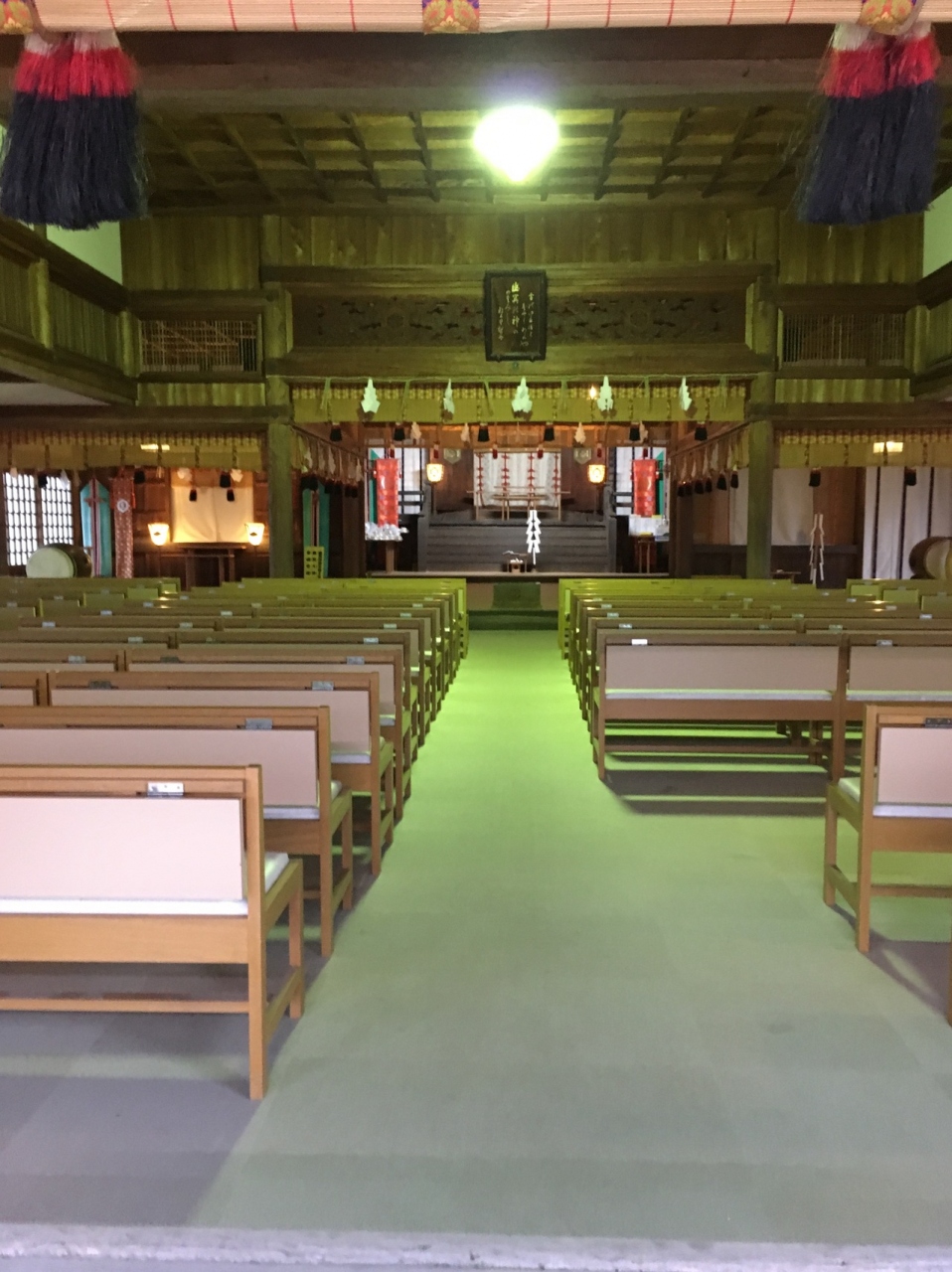 現在の神楽殿は昭和56年に造営されました。その大広間は270畳敷きの広さをがあり、ここに掛かるしめ縄は長さ13.5m、重さ4.4tの巨大なもので知られています。