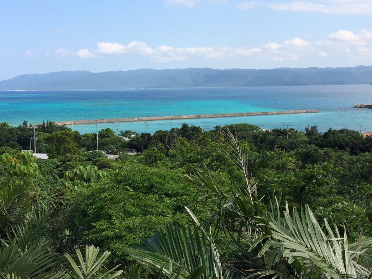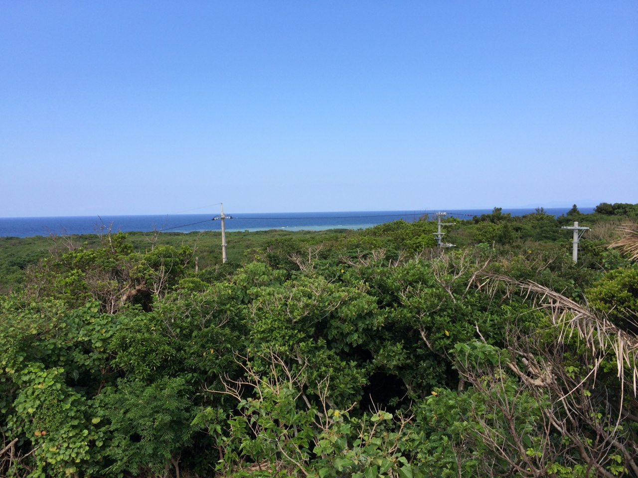 ひ~ひ~ぜ~ぜ~言いながら登って辿り着いた鳩間島最高峰の鳩間中森。その一番高いところにある物見台から眺める景色は青・白・緑のグラデーションが360°広がっていました。