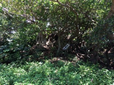 鳩間島周回道路脇にある『千手ガジュマル』。その向かい側にあるガジュマルの木が『五兄弟ガジュマル』です。