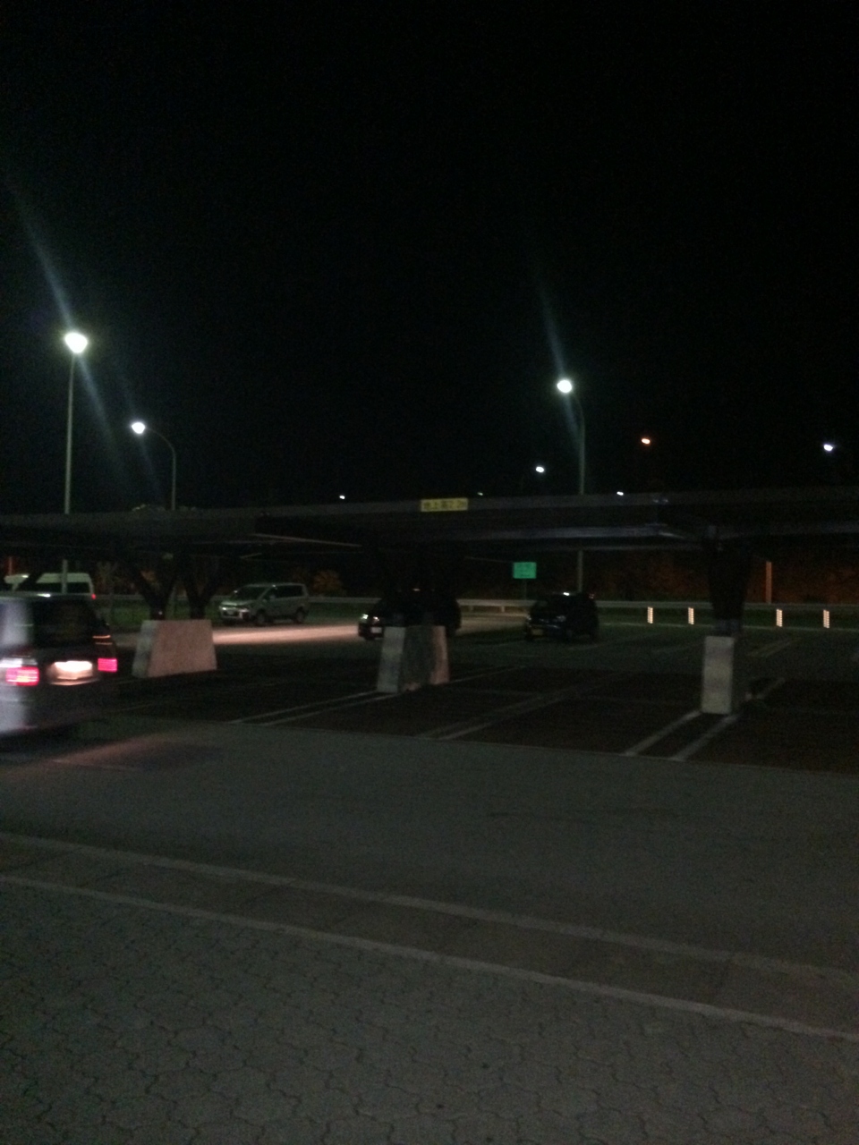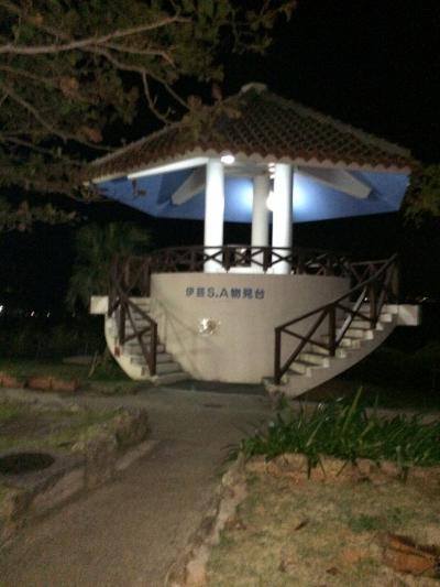 屋嘉インターと金武インターの中間にある伊芸サービスエリアは、許田インターから那覇方面に向かうのに初めての休憩施設です。昼間であれば展望台より太平洋や宮城島・伊計島を望むことができる絶景ポイントではあるものの、さすがに夜間では篝火(のような)ものしか見えませんでした。