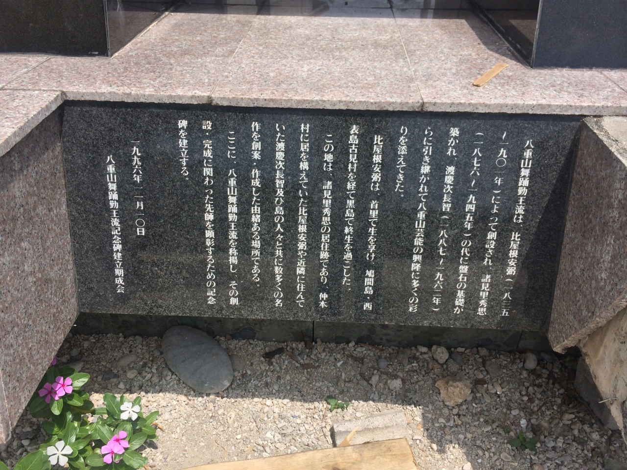 首里で生まれた比屋根安弼は、鳩間島・西表島古見を経て黒島にて亡くなられたそうです。また黒島は諸見里秀思の居住跡であり、仲元村に居を構えていた比屋根安弼や近隣に住んでいた渡慶次長智及び島の人々と共に数多くの名作を創案・作成した由緒ある場所として現在に引き継がれています。