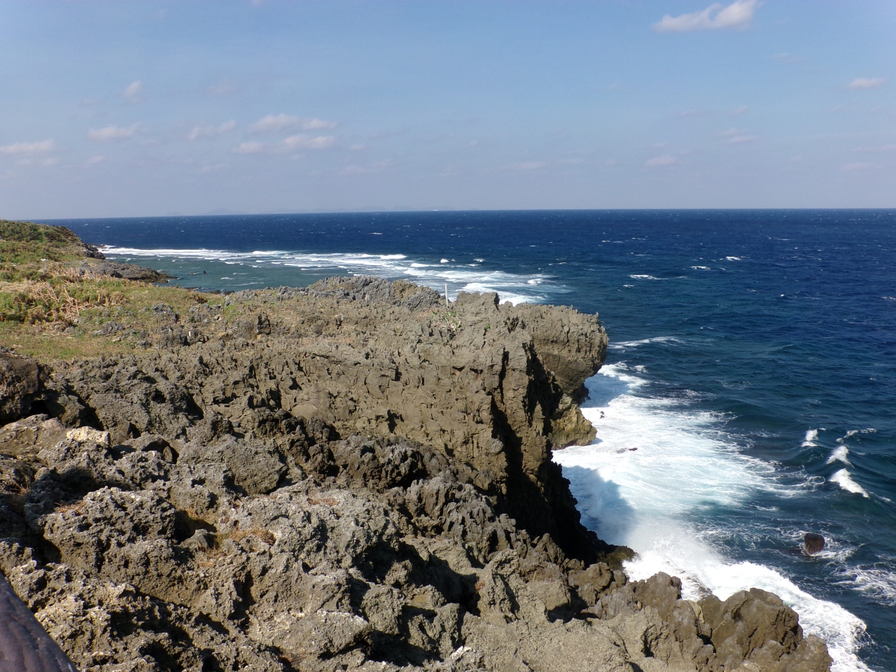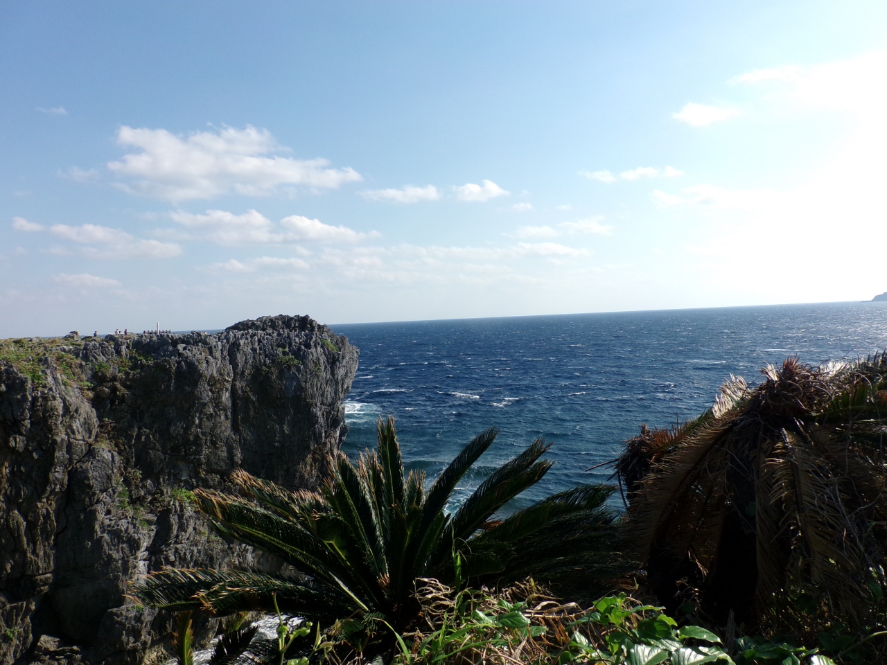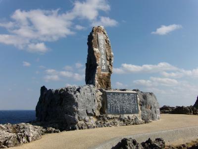 沖縄本島最北端辺戸岬。東経128度15分56秒、北緯26度52分18秒に位置し、約22km先には鹿児島県の与論島や沖永良部島があり晴れた日には望むことができます。