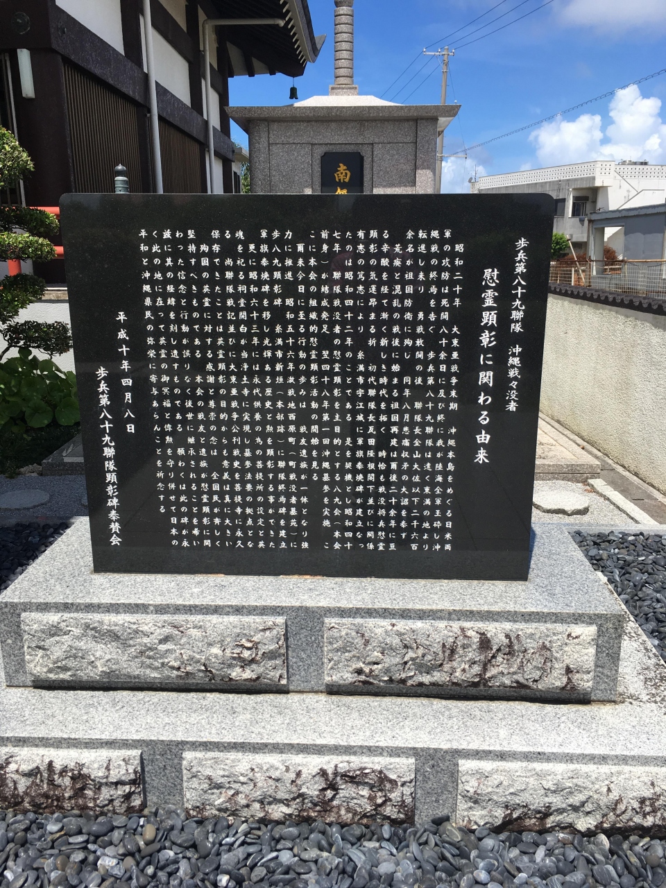 昭和56(1981)年には激戦地西原町(当時は村)の西原の塔敷地内に?独立歩兵第八十九連隊顕彰碑?と連隊本部終焉之地糸満市荒垣に?歩兵八十九連隊玉砕終焉之地碑?が建立され?軍旗奉焼之地碑?の移設が行われ、連隊の足跡が広くわかるようにされました。更に昭和63(1988)年には永代供養を行う菩提寺が設定され、この浄土寺が定められました。