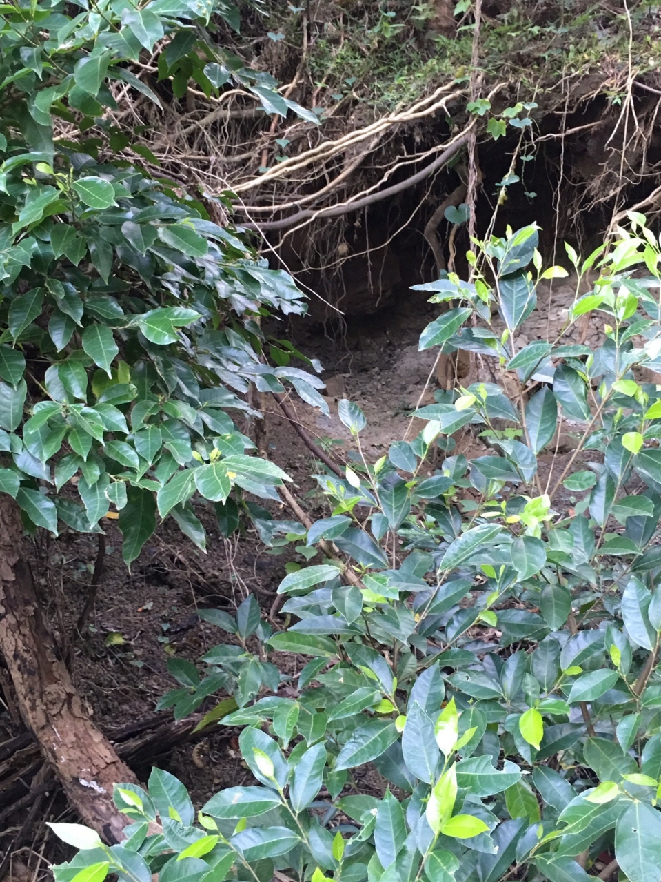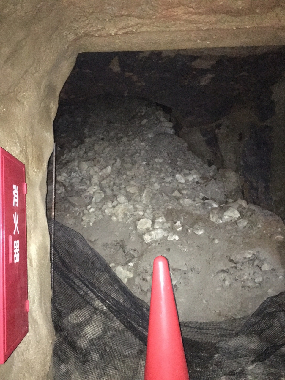 周辺の畑の土だと思われますが壕内に多量に流れ込んでおり、壕の内部には立ち入ることはできないものの、階段が刻まれており壕入口までは立ち入れるようです。しかし天候等によっては足元が大変悪くなるため、あくまでも自己責任で行わねばなりません。