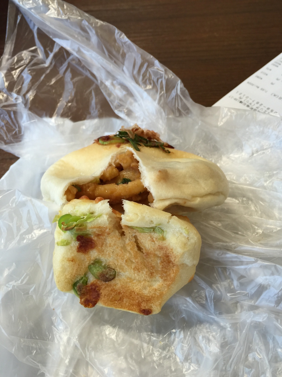 ネギがトッピングされており、一見するだけではなんとも思わないのかも知れません。中を割ってみると醤油で味付けられた?おうどん?が姿を見せ、妙な組み合わせに苦笑しました。炭水化物同士の組み合わせに違和感を感じるところもありますが、以外に食べてみると絶妙のバランスであることが判明しました。意外と癖になる味でした♪- 旅行時期