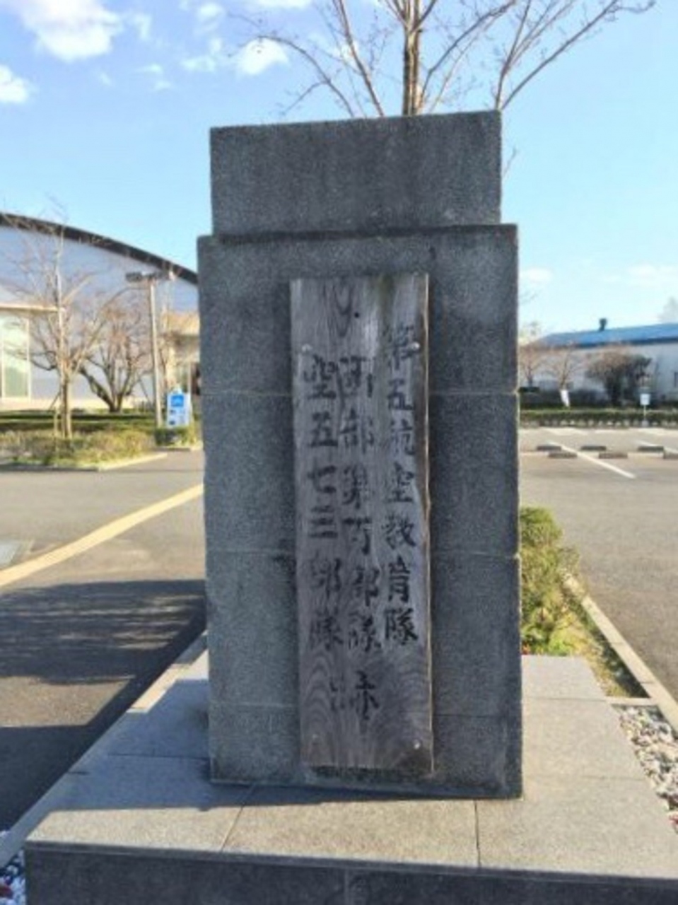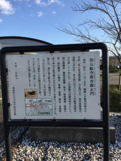 大刀洗平和記念館入口にある?第五航空教育隊正門?の碑は、記念館のオープンに合わせて移設されたものになります。昭和14(1939)12月第五航空教育隊開隊、航空技術兵の養成を目的に約1,000名でスタートします。そして戦争に突入し、技術兵の養成が急務とされる中修学兵も増加し、最大時には約6,000名もの隊員を擁していました。