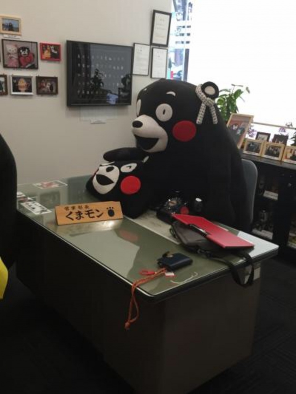 くまモン部長の活躍とは裏腹になかなか聖地を訪れる機会がなく、やっと巡ってきた福岡行きのチャンスを無理やり熊本迄広げて今回につながりました。春休み前でありながらくまモン部長の?出待ち?をする今と昔の少年少女に交じっていると・・・、ついにお出ましです♪