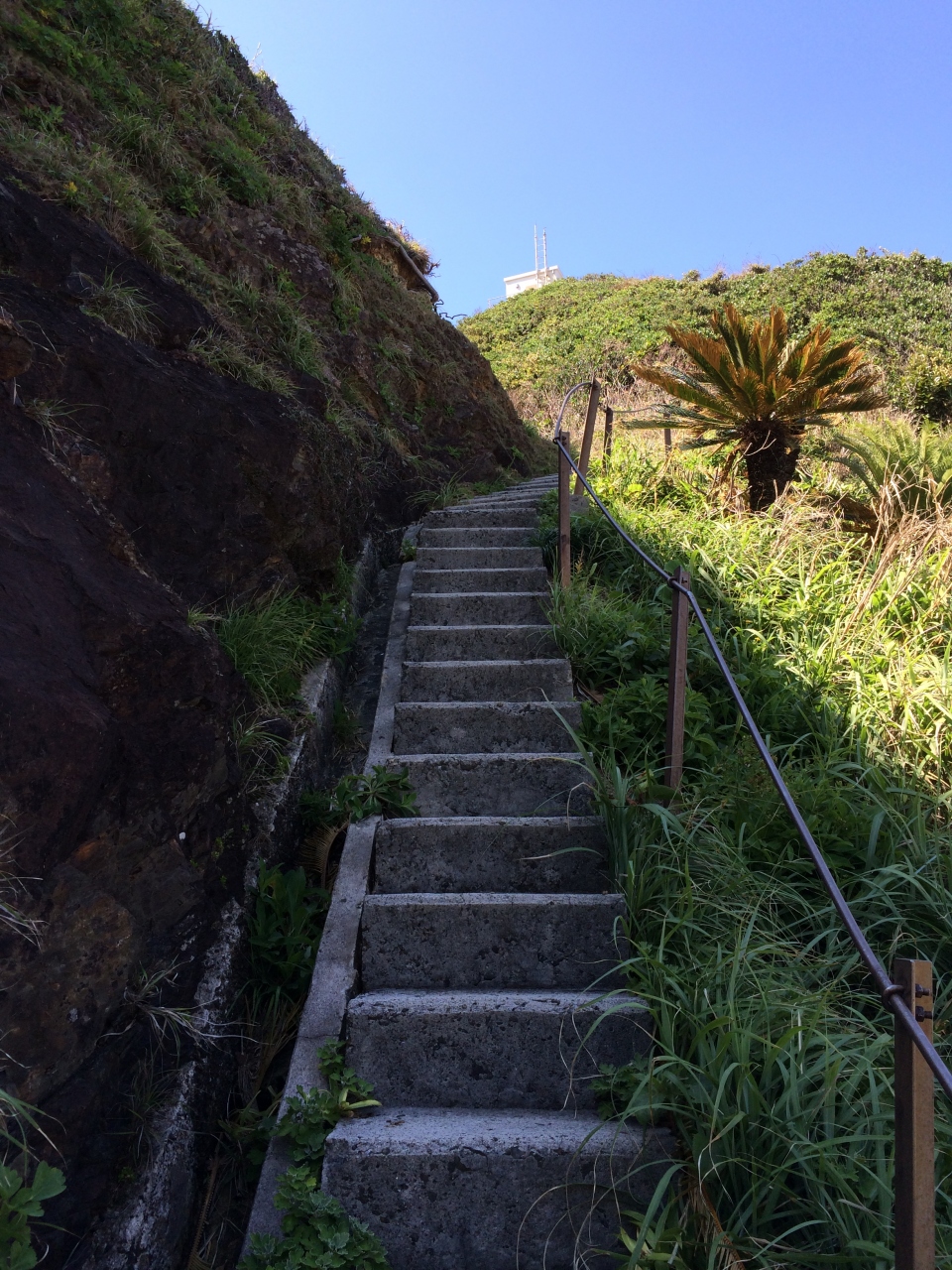 最寄りのあやまる岬から山の斜面を伝って歩いてくることもできますが、階段は刻まれているものの結構骨が折れる勾配であるため、子供連れで訪れる場合は観光公園の駐車場に7車を停める方が無難かと思います。