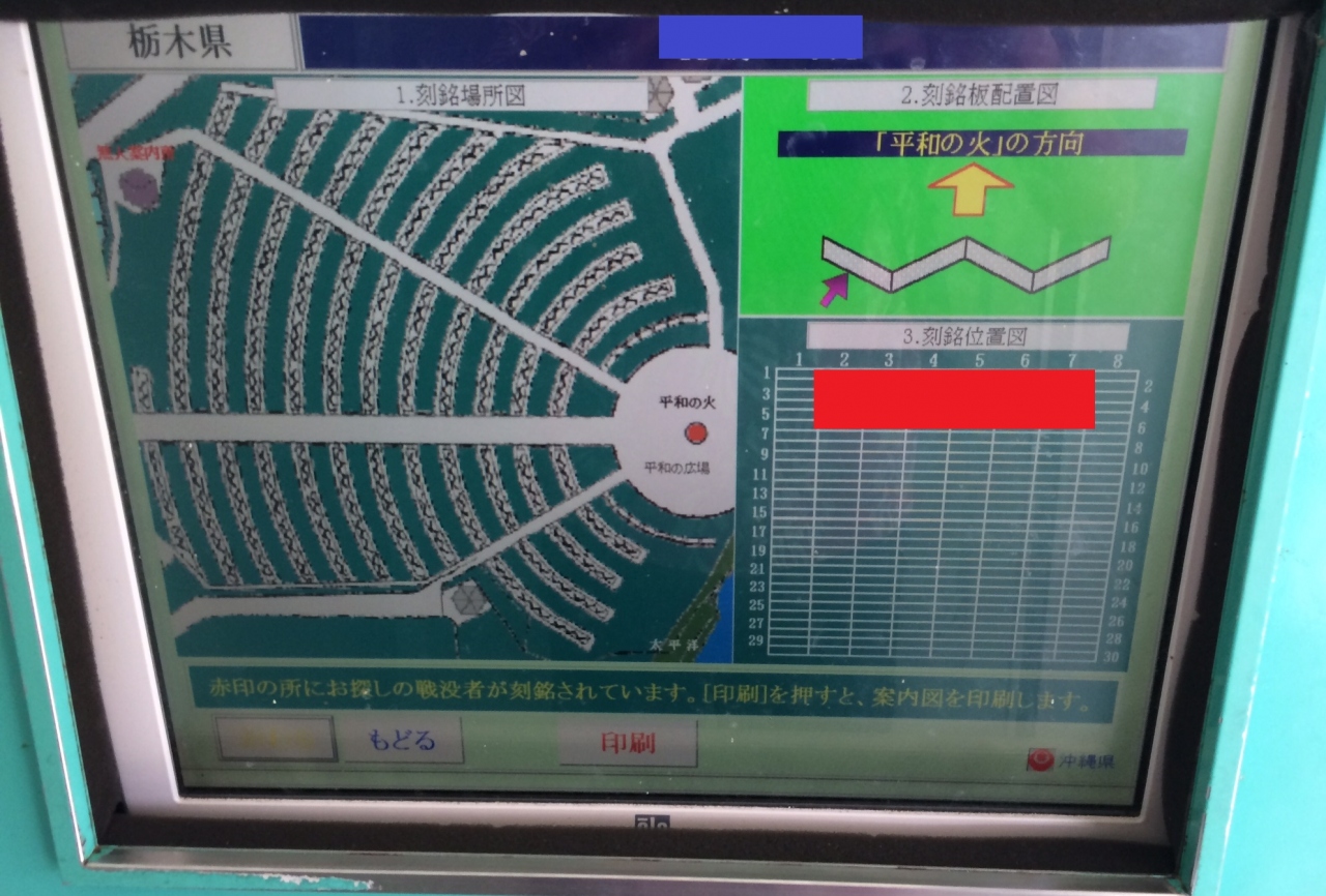 沖縄戦で亡くなられた国籍問わない戦没者の方々のお名前が刻まれている平和の礎、毎年遺族の高齢化が進む中、?追加記銘?が増えている現実は周知の事実です。現在戦没者遺族と定義されている(注:恩給法とは無関係)孫世代が、曾孫世代まで拡大される2016年度との記事が書かれることも避けられない事実を背景にしています。一応母方の祖父が沖縄で戦死していることもあり、この平和の礎には来沖時には立ち寄っていました。仕事柄平日休みの旅行中、この礎を目的として訪れておられる方々を見ることがなかったこともありました。花売りのおばあに絡まれたことなど、関係ないことばかりが記憶に残っています。その今までの記憶を覆すことがありました。6月23日の慰霊の日の出来事です。私は祖父の記銘位置はなんとなく覚えているので、さっさと目的の場所へと向かいます。そしてお参りを済ませ、戻って来ると礎入口にある記銘場所を探す?パソコン?の前に人だかりができています。あらかたご年配の方がトロトロしているんだろう…と思ったものの、なんとなくその行列を遠回しに眺めていたところ?予想通り?…。とはいえ後につながる方々もご年配の方が続いており、?誰か…?という視線を感じて、やっと?どうかしました??とヒトコト。ようは探し方もわからんし、(図の)見方もわからん…。探し方をレクチャーし、ここですよ〜と教えたら終わりかと思いきや、?まだいるんだけど〜?。ここまで気付かなかった私が無頓着でした。特に沖縄の方々の場合は戦没者=家族一人ではないという事実を。そのことを知って顔色をなくしたのですが、そこは冷静を保って終わらせ、次の方に?わかりますよね〜??っと聞いたものの?やって?との言葉に押され続け、5人のご遺族で約20名の戦没者記銘位置の検索をお手伝いしました。