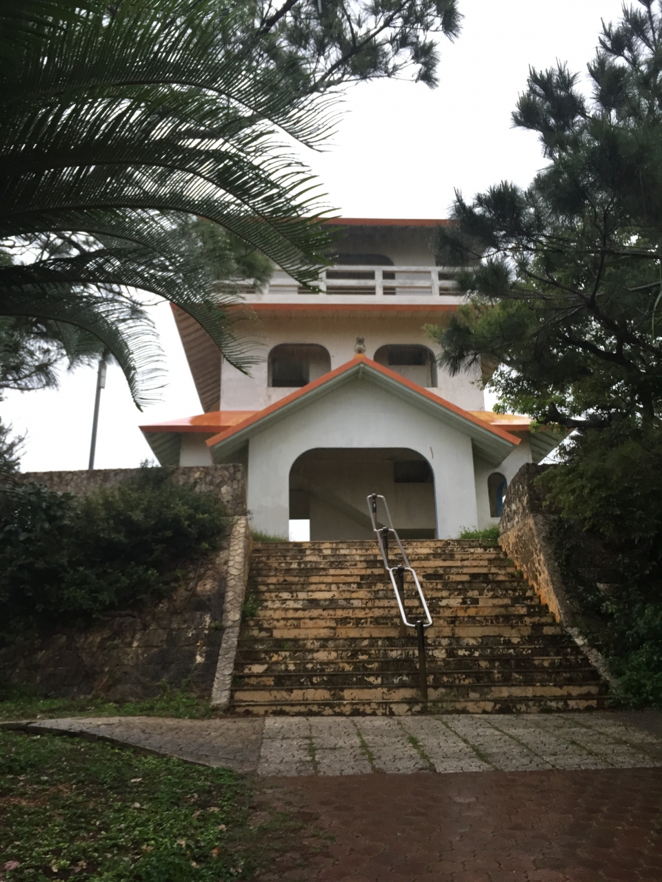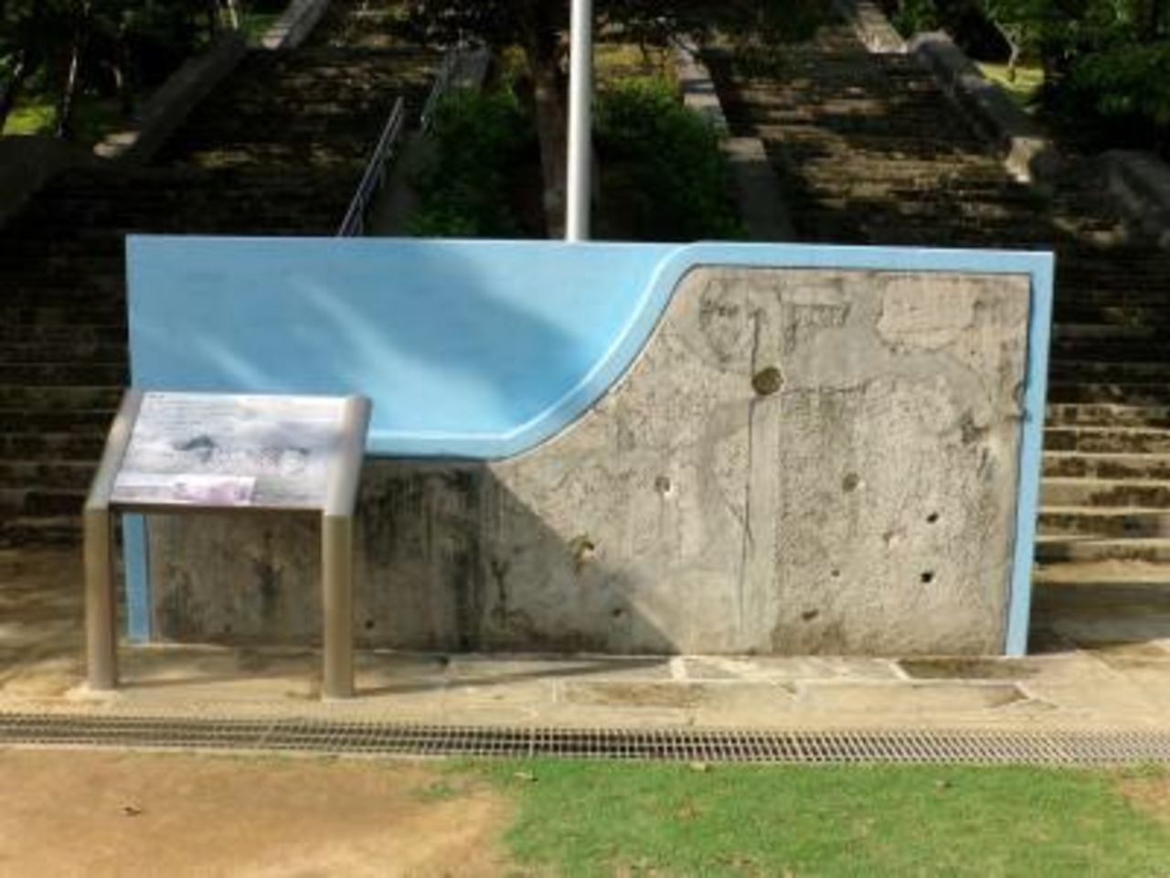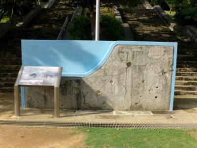 展望台へと登る階段の脇には、以前嘉数の集落にあった?弾痕の残る壁?が移設されています。頂上部手前には日本軍が作った豪が残っています。立ち入り禁止ではあるものの、頂上部のトーチカと繋がっているとのことでした。そして頂上部には先述したトーチカの他、京都の塔・嘉数の塔などの慰霊塔が建立されています。