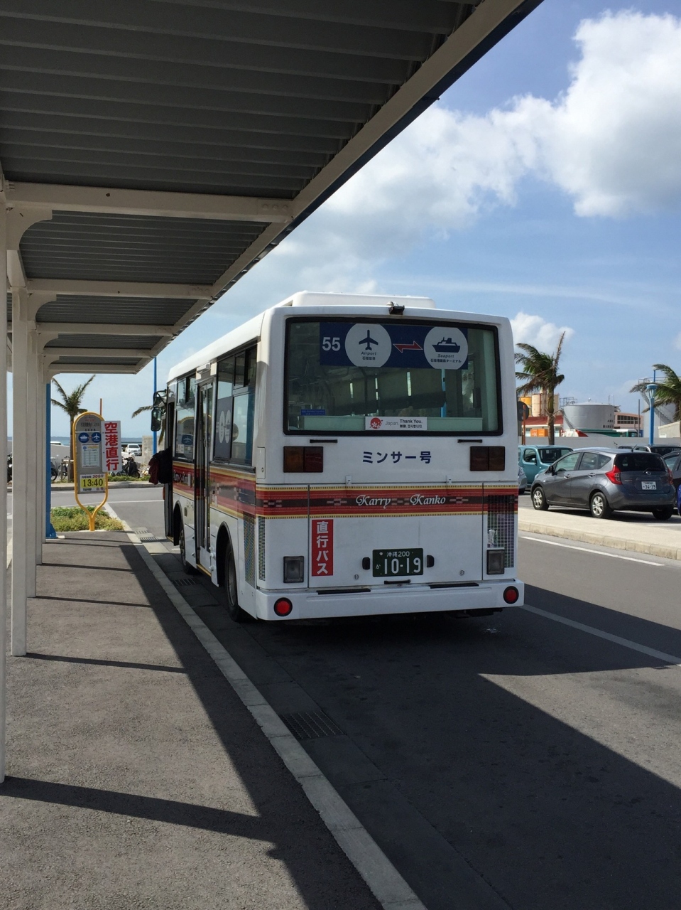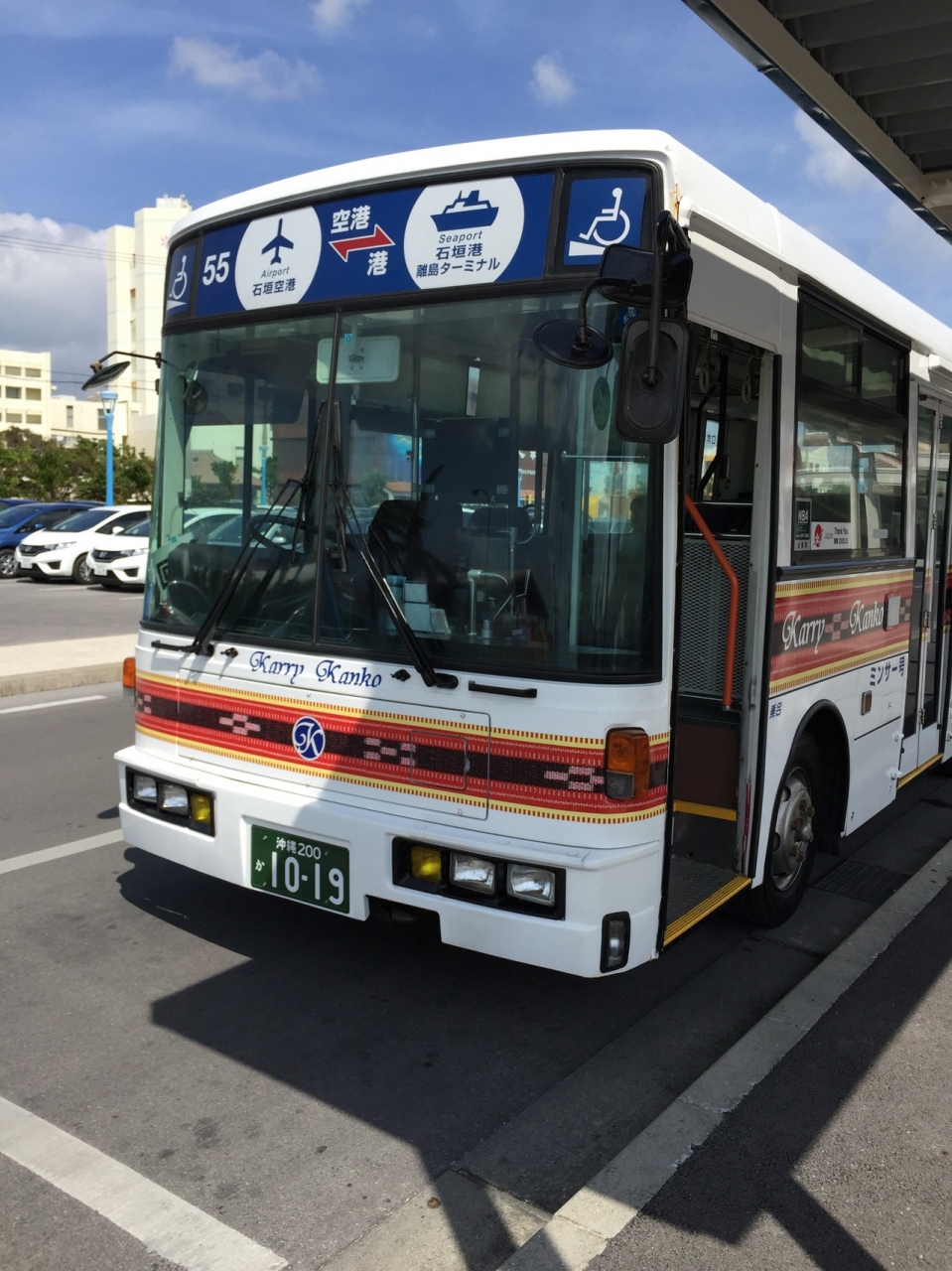平成27(2015)6月22日より美ぬ島石垣空港から石垣港離島ターミナル間を所要時間30分、ノンストップで走る路線バスの運行を開始しました。元々は沖縄本島の豊見城に本社がある観光バス会社ですが、一般路線許可を受け、石垣島の路線バスを運行しています。参入時期が遅れたり、運行開始当初はドライバーの運転に対し不安視する声もありましたが、今ではそんなことはありませんでした。