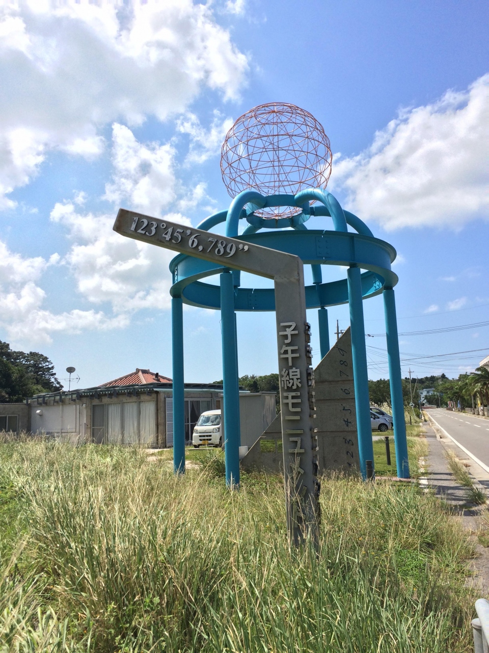 県道215号線沿いの祖内集落に位置するこの子午線のモニュメントですが、この場所に東経123度45分6789秒の子午線が通っていることがわかったことにより作られたものです。夜には空へとレーザーが照射され、幻想的な光景が見られるとのことですが、昼間だとただのモニュメントにしか見えません。