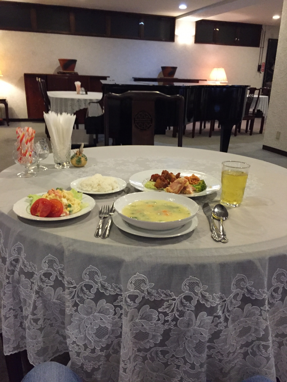 食事は一階のレストランで頂くかたちですが、これもまた本格的なコース料理。調度品のことをとやかく言う方もおられますが、ペンションの特徴とすれば納得がいくのではないでしょうか。