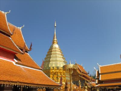 チェンマイの有名な寺院。少し遠いですが、チャーン・プァク門のソンテオ(赤色の乗り合いタクシー)乗り場に行けば行先も書いてあるので、自力でアクセスできます。ちなみにトラックの荷台で1000m近く上るのですが、乗り心地は悪いです。黄金のお寺ですが、天気も良くて青空だったので、黄金が映えた感じでした。周辺からの景色もよく、観光客も多かったです。