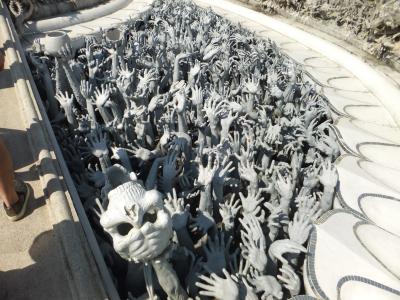 チェンマイからチェンライに向かい、町に着く手前くらいにあります。私の場合イレギュラーで、チェンマイ~チェンライのバスチケットが取れず、数人でタクシーをシェアしてチェンライに向かう途中で、運転手さんと交渉して寄ってもらいました。有名デザイナーが手掛けている白いお寺、未完成で入場料やらグッズ収入を元に完成を目指しているらしいです。無数の腕、骸骨、ツボ、竜、色々な意味ですごいです。
