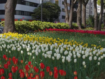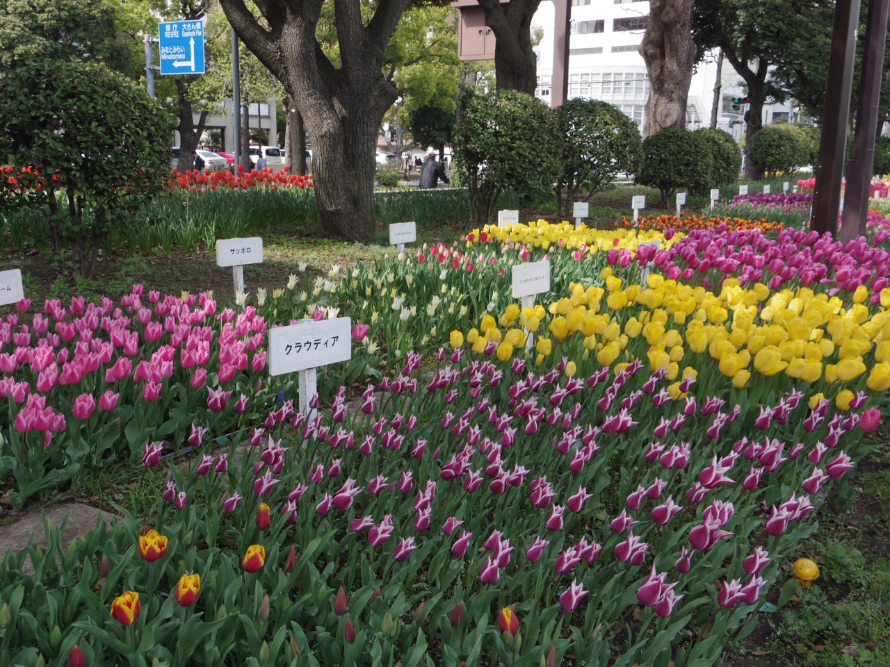 JR関内駅からすぐ。横浜スタジアムの周りが公園になっていて、花壇にたくさんのチューリップが植えられています。