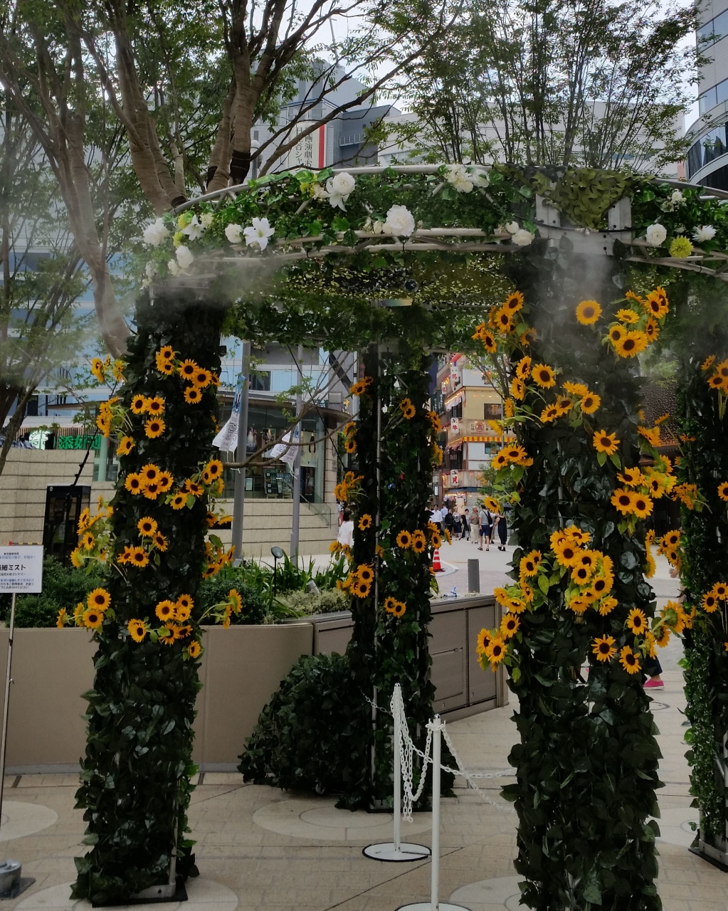 千代田線日比谷駅利用の私にとってはとても分かりやすかったです。地下エントランスの手前にはエレベーター。その先に巨大空間が広がり、左右にはコンビニやパン店などの普段使いの店が並んでいます。天井が高く、奥行きも横幅もある空間が地下に存在する意味を考えさせられます。長いエレベーターを上がり地上に出ると、猛暑対策のミストコーナーがありました。聞いていた通り、メガネに雫がつきません。専門店街はまた次の機会に。