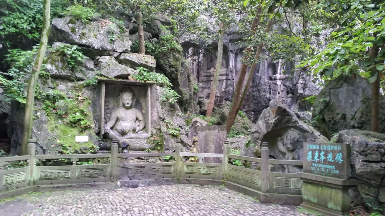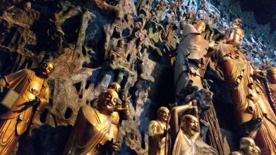 霊隠寺は飛来峰景区の一角にあります。路線バスなら8:00始発のY2ループバスが便利ですが7:00前の出発で7路バスを利用。終点まで30分余り。境内はとても広いです。大雄宝殿の金ぴかの仏像、荘厳な薬師殿、五百羅漢堂のずらりと並ぶ怒り顔などなど、見飽きないほど興味深いです。じっくり参拝したければお寺だけでも半日、飛来峰景区すべてを巡るとしたら1日がかりでしょうね。