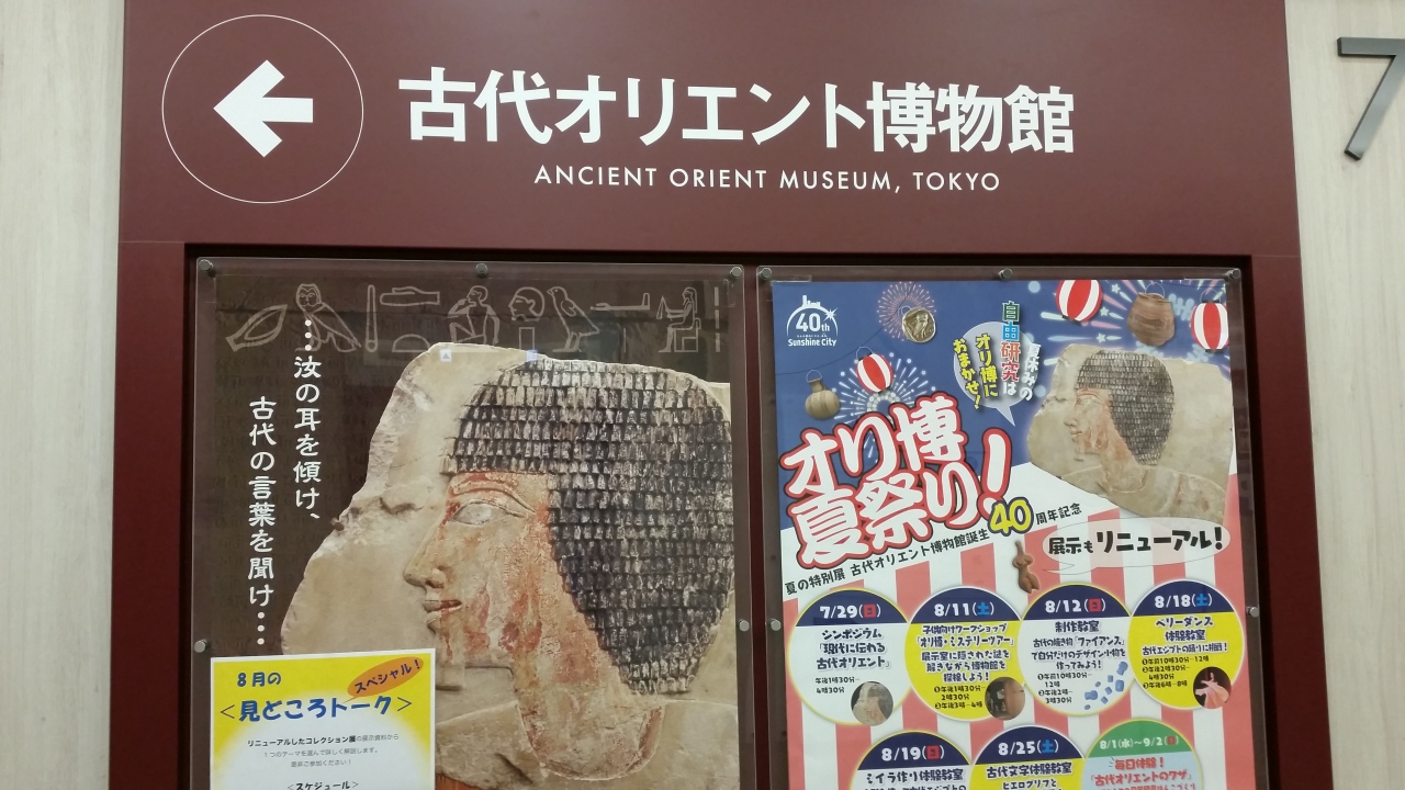 エレベーターを降りると静謐な空間が現れます。細い廊下を進みチケットを購入。さあ、学問の海に出発です。壁にかかった地図には関連する地名がびっしり。指で押すと説明文が表示されます。ここでやる気スイッチON!ちょうど「オリ博夏祭り」と称した特別企画が開催中で、様々な収蔵品が展示され、興味をかきたてられました。出口付近にはオリエント全般を説明する映像が放映されていました。にぎやかなサンシャイン界隈で、ここだけは静かな別世界でした。