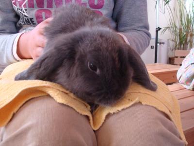 だっこは膝に外側を向けてうさぎを抱きます。だっこは気持ちよさそうで撫で...