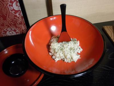 圧巻は大きな朱塗りの鉢に盛ったお茶の葉が散らされた大量の御飯。