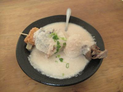 生姜醤油で食べるのが特徴の姫路おでんですが、この店は酒蔵「灘菊」のお店らしく、酒粕バージョンの「白おでん」を頂けます(生姜醤油味は「黒おでん」)。