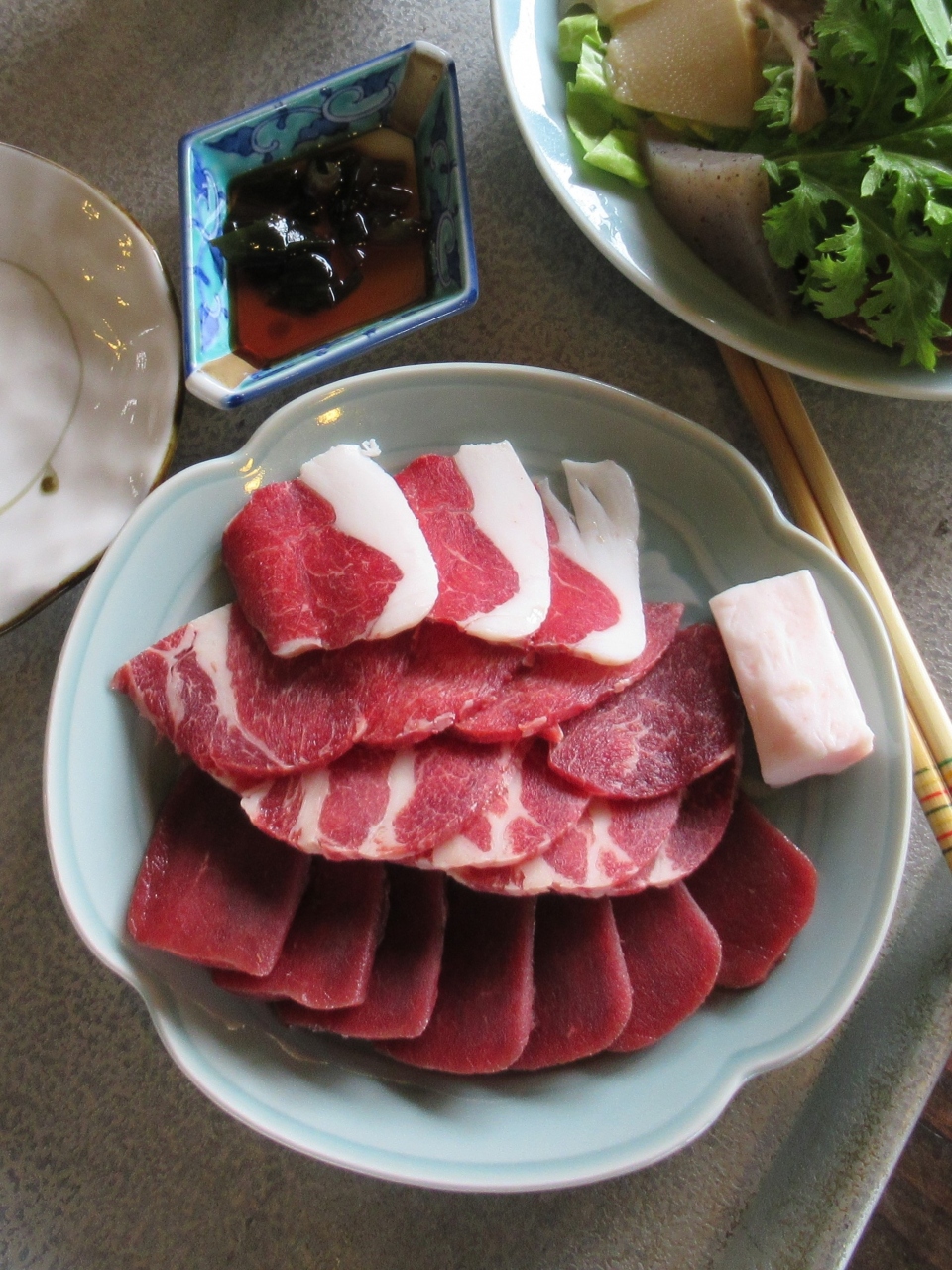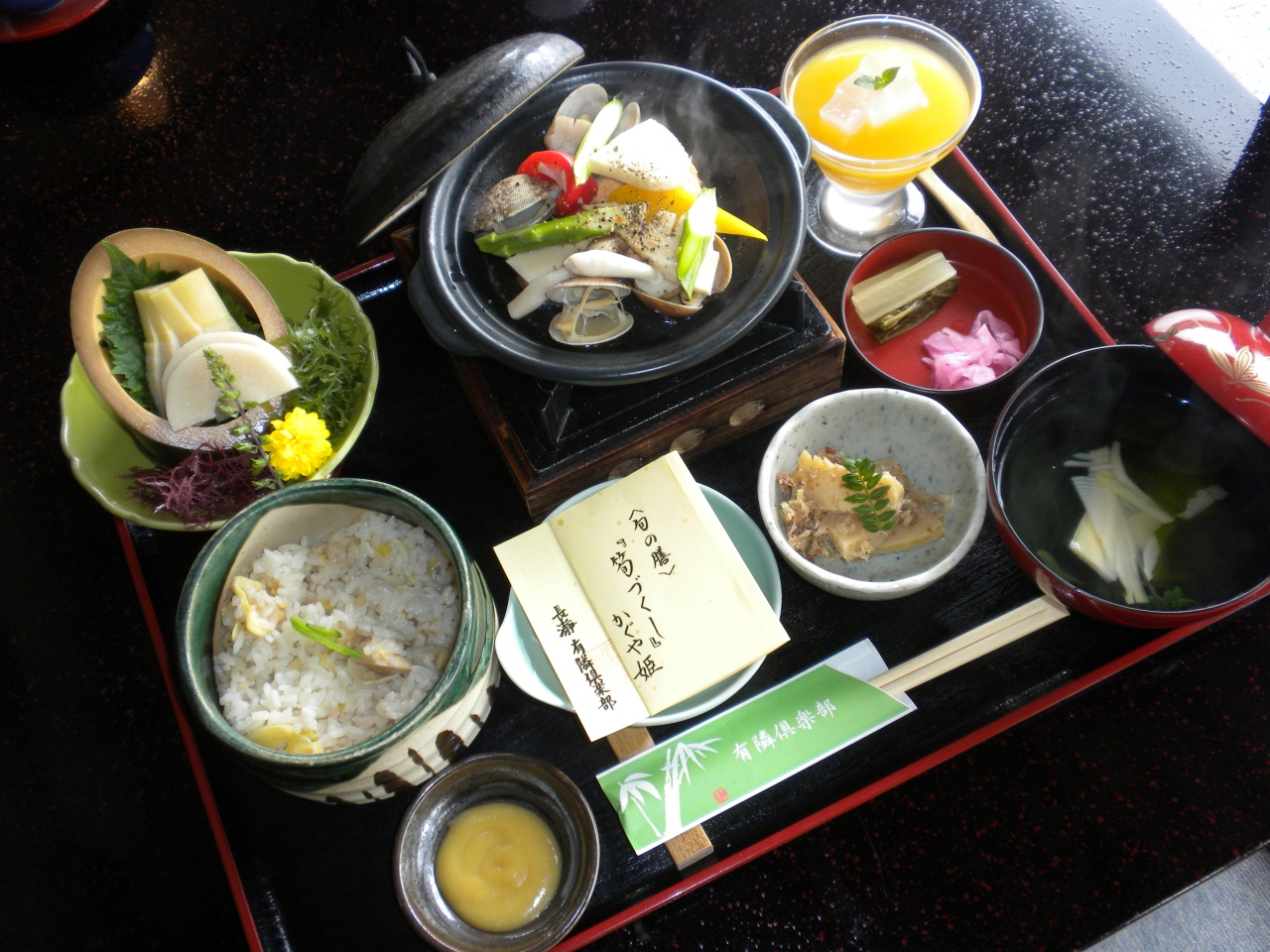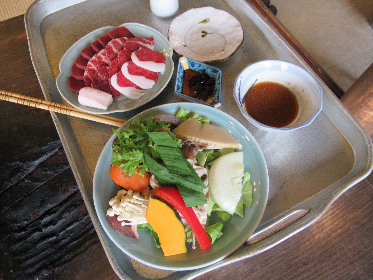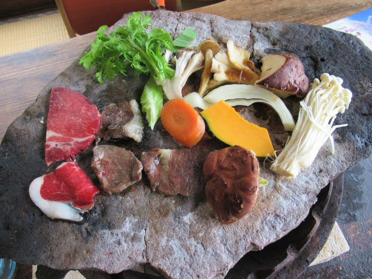 石器焼料理は厚さ4cmもある砂岩をガス火で熱し、その上で山野菜・きのこ・野獣肉等を焼きます。