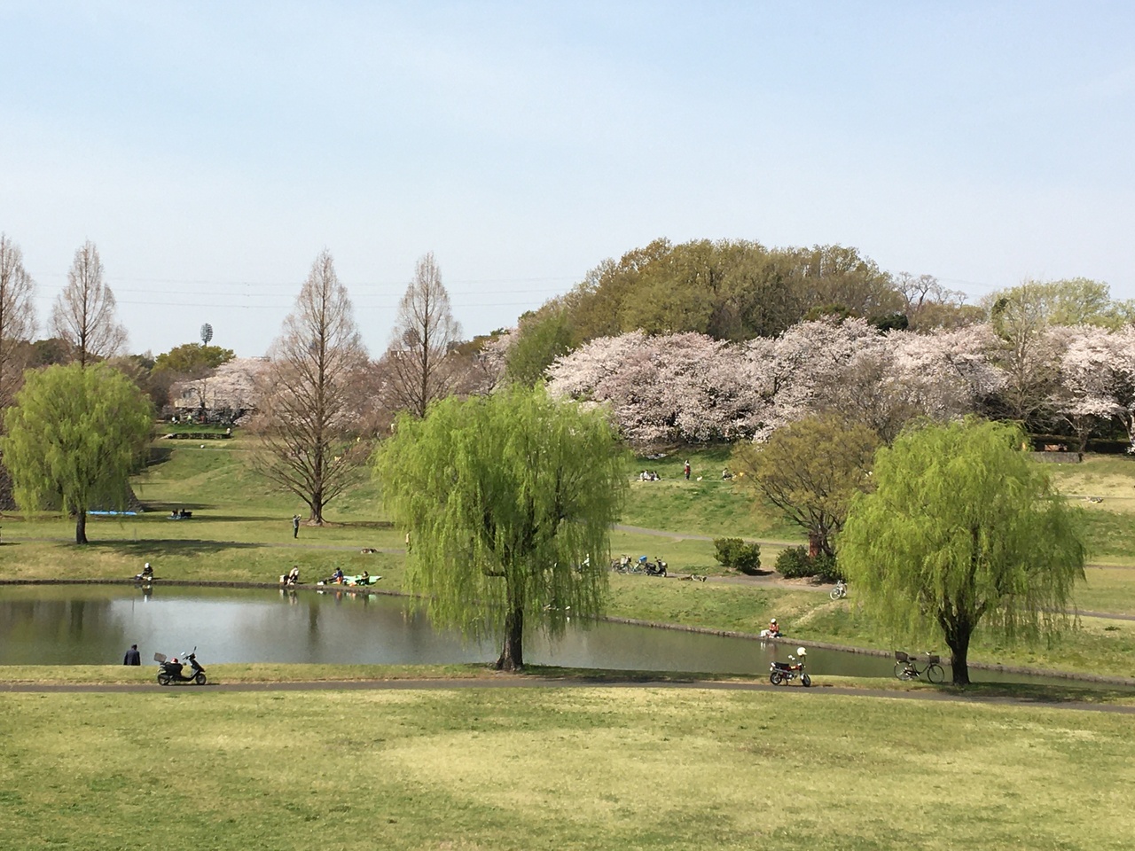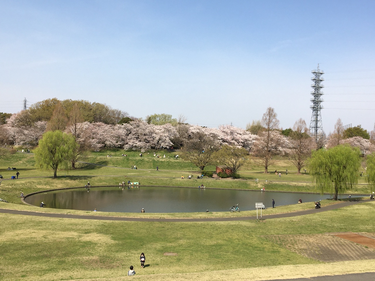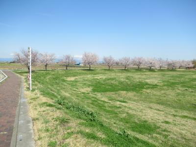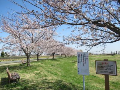 公園を囲む土手の桜並木はまさに満開の美しさで、穏やかで暖かい日差しの中、既に舞う花びらも見られました。