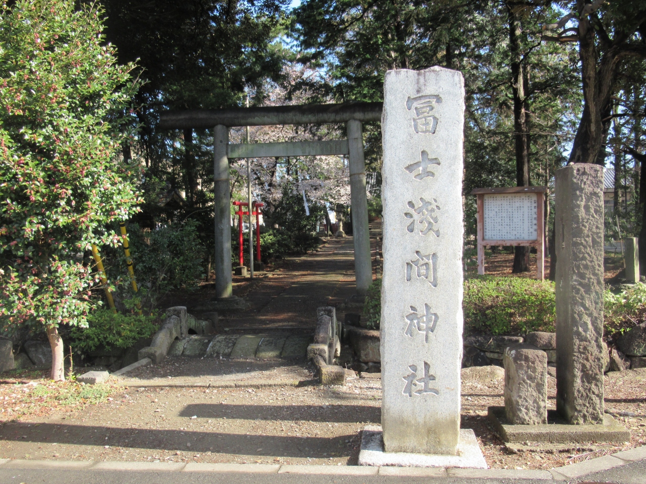 往時の遺構は公園の東側にある富士浅間神社脇にある堀跡だけですが、石垣や塀などが模擬復元されています。