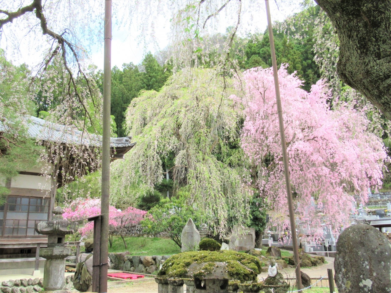 後を追うように咲くベニシダレは見頃の域。